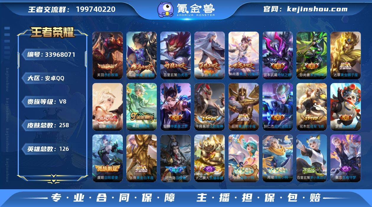 安卓Q-V8-最强王者段位-126英雄-258皮肤-1典藏皮肤-17传说-71史诗 【英雄全皮】:敖隐全皮,空空儿全皮 【荣耀典藏】:关羽赤影疾锋 【传说皮肤】:马超神骥逐星野,桑启鸣野蒿,貂蝉曦玄引,孙尚香乘龙问璇玑,虞姬启明星使,张良黄金白羊座,干将莫邪久胜战神,达摩黄金狮子座,百里玄策白虎志,花木兰冠军飞将,梦奇胖达荣荣,后羿黄金射手座,貂蝉仲夏夜之梦,李白凤求凰,孙尚香末日机甲,宫本武藏地狱之眼,狄仁杰超时空战士 【限定皮肤】:暃埋骨钱,蔡文姬夏日便利店,虞姬夏日便利店,狄仁杰阴阳师,赵云皇家上将,赵云引擎之心,高渐离玩趣恶龙,芈月幻夜卜梦,元歌云间偶戏,元歌无心,夏侯惇朔风刀,狄仁杰魔术师,狄仁杰万华元夜,达摩沙漠行僧,项羽海滩派对,老夫子醍醐杖,关羽冰锋战神,程咬金演武夺筹,露娜一生所爱,韩信飞衡,韩信傲雪梅枪,兰陵王金庭之子,花木兰瑞麟志,亚瑟潮玩骑士王,孙悟空美猴王,孙悟空至尊宝,孙悟空孙行者,后羿辉光之辰,李元芳银河之约,李元芳云中旅人,虞姬启明星使,钟馗驱傩正仪,干将莫邪冰霜恋舞曲,雅典娜黎明之约,蔡文姬繁星吟游,太乙真人饕餮,东皇太一逐梦之光,鬼谷子原初探秘者,鬼谷子五谷丰年,黄忠火炮绅...