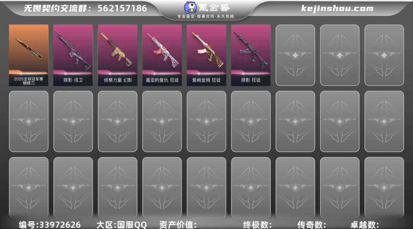 【套装】:2025全球冠军赛套装,无畏契约季前邀请赛套装,回火礼包:掠影套装,掠影//3.0套装 【英雄】:幻棱,炼狱,维斯,暮蝶,钛狐,壹决,铁臂,捷风,雷兹,幽影,不死鸟,贤者,猎枭,蝰蛇,零,芮娜,奇乐,尚勃勒,霓虹,斯凯,K/O,盖可,黑梦,钢锁 【近战武器】:近战武器-2025全球冠军赛 蝴蝶刀,近战武器-影蝶,近战武器-无畏契约季前邀请赛 悲悯之刃,近战武器-紫金爪刀,近战武器-诡秘蛇影 军刀 【狂徒】:狂徒-2025全球冠军赛,狂徒-掠影,狂徒-盖亚的复仇,狂徒-紫阙金琅,狂徒-诡秘蛇影 【幻影】:幻影-侦察力量,幻影-掠影//2.0,幻影-末日之翼 【戍卫】:戍卫-掠影,戍卫-折光棱晶 【冥驹】:冥驹-掠影 【飞将】:飞将-末日之翼 【莽侠】:莽侠-诡秘蛇影 【奥丁】:奥丁-掠影//2.0,奥丁-末日之翼 【判官】:判官-诡秘蛇影 【骇灵】:骇灵-无限竞技 【蜂刺】:蜂刺-折光棱晶 【追猎】:追猎-掠影//3.0 【标配】:标配-折光棱晶 【正义】:正义-奇点,正义-纳米打击 【鬼魅】:鬼魅-天界神兵,鬼魅-诡秘蛇影 【短炮】:短炮-末日之翼 【卡面】:终章:激斗汉堡 卡面,进入射程 卡面,激斗汉堡 卡面,《双城之战》拥抱 卡面,精灵大战 卡面,欢迎来到底城...