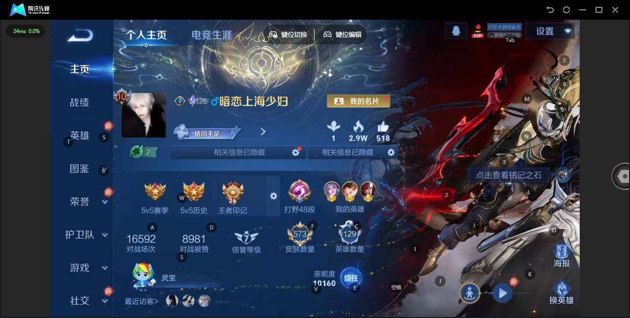 2550601-【兔年限定】贵族等级: V10 英雄数: 129 皮肤数: 573 荣耀水晶: 武则天,倪克斯神谕,杀手不太冷,鸣剑·曳影,最初的交响 无双皮: 碎月剑心,韩信群星魔术团,离恨烟,问心剑 星传说: 幻海之心,未来机甲,幽冥之眼,零号·雷霆,星际治安官,破晓神光,游龙堇华 传说皮: 黄金狮子座,黄金射手座,冠军飞将,云鹰飞将,绛天战甲,黄金白羊座,猫影幻舞,久胜战神,炽阳神光,一念神魔,末日机甲-孙尚香,地狱火,零号·赤焰,海洋之心,地狱之眼,飞鸢探春,李逍遥,时之恋人-刘备,游龙清影,淬星耀世,超时空战士-狄仁杰,遇见胡旋,挚爱之约,挚爱花嫁,无双飞将,音你闪耀,神器·狴犴令,山海·炽霜斩,山海·琳琅生,山海·苍雷引,炽翼辉光,浮生妄,灼幽烈阳,鹤归松栖(云缨),霜月吟,澜逐花归海,艾琳觅芳踪,琥珀纪元铠,琥珀纪元马超,乘龙·问璇玑,乘龙·铭钟鼎,乘龙·淬吴钩,貂蝉曦玄引,吕布曦玄引,典韦战鼓燎原,落雪白狼,金乌负日,黄金天蝎座,云中君群星魔术团,千山共赴,神树通天,神骥·逐星野,神骥·聚万邦 限定皮: 冰锋战神,遇见飞天,李小龙,奔雷神使,祈雪灵祝,游园惊梦,梁祝,御风骁将,云端筑梦师,时雨天司,引擎之心,龙胆,白鹤梁神女,武圣,烈魂,魔法小厨娘,辉光之辰,异界灵契-孙尚香,玄嵩,白晶晶,岱宗,天狼溯光者,天...