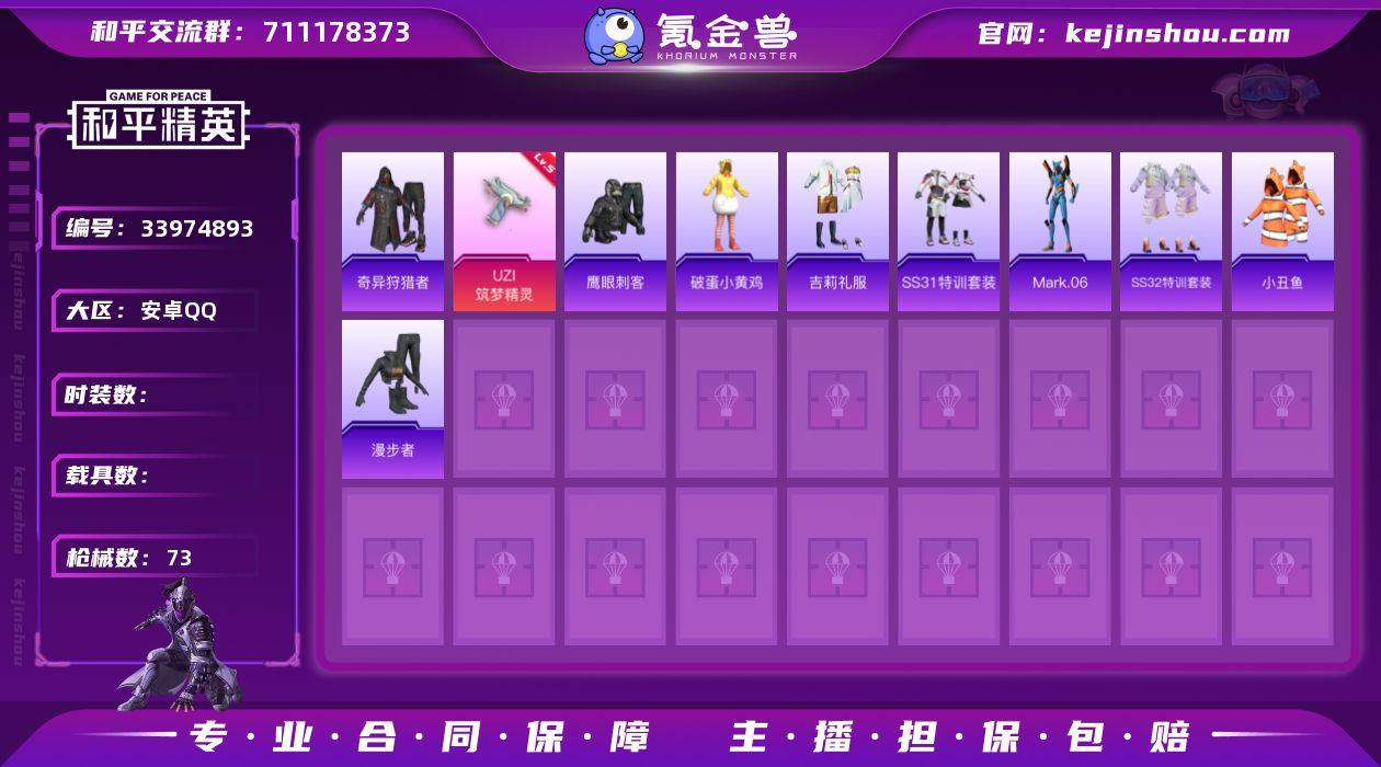 安卓Q 可二次 1特效枪54套装73枪皮 奇异狩猎者 UZI-筑梦精灵(5级) Mark.06 小丑鱼 鹰眼刺客 漫步者 破蛋小黄鸡 和平精英账号
