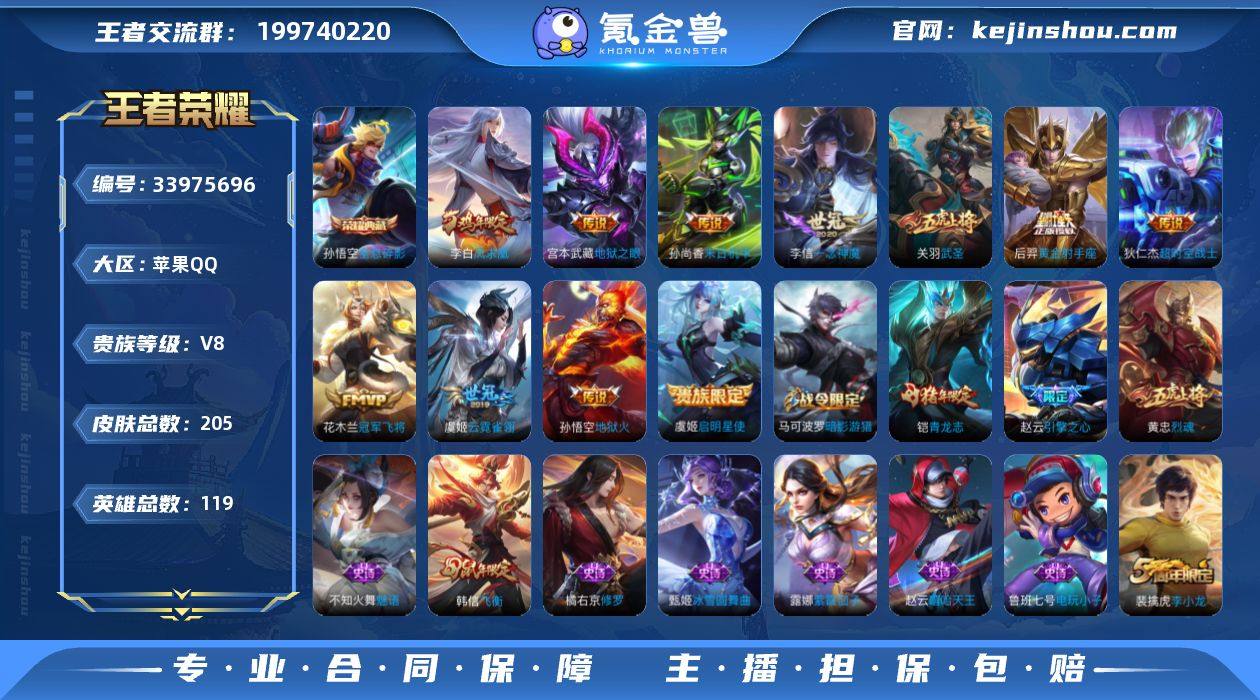 实名: 可修改 性别: 男号 贵族等级: V8 英雄数: 119 皮肤数: 205 荣耀水晶: 全息碎影 传说皮: 黄金射手座,冠军飞将,一念神魔,云霓雀翎,末日机甲-孙尚香,地狱火,地狱之眼,超时空战士-狄仁杰 限定皮: 遇见飞天,李小龙,梁祝,引擎之心,武圣,烈魂,飞衡,逐梦之音,凤求凰,青龙志 亮点: 【优质装备】:全息碎影(猴子典藏),黄金射手座,冠军飞将,一念神魔,云霓雀翎,末日机甲-孙尚香(绿蚂蚱),地狱火,地狱之眼,超时空战士-狄仁杰