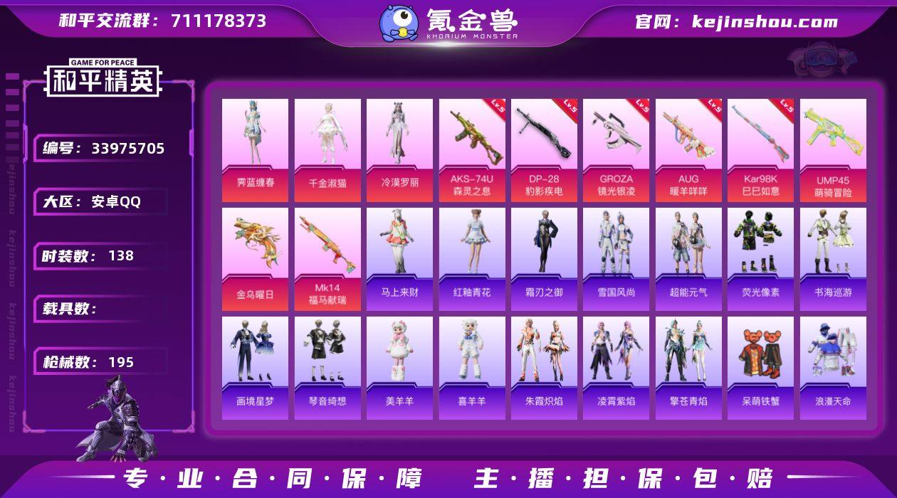 安卓 手Q-3粉装-8特效枪-0载具-1粉色飞行器-57280热力值-9王牌印记-138套装-195枪皮 【热门品类】:套装-浪漫天命,套装-龟仙人 【粉色套装】:角色-千金淑猫,角色-冷漠罗丽,角色-霁蓝缠春 【粉色枪皮等级】:GROZA-镜光银凌(五级),AUG-暖羊咩咩(五级),AKS-74U-森灵之息(五级),Kar98K-巳巳如意(五级),DP-28-豹影疾电(五级) 【粉色枪皮】:GROZA-镜光银凌,AUG-暖羊咩咩,UMP45-萌骑冒险,AKS-74U-森灵之息,Kar98K-巳巳如意,Mk14-福马献瑞,DP-28-豹影疾电,信号枪-金乌曜日 【粉色飞行器】:炫彩糖果飞行器 【粉色降落伞】:临安公主降落伞,翎光蝶翼降落伞,绯果甜心降落伞,星穹咏叹调降落伞,绯穹魔姬降落伞,异瞳寒姬降落伞,炫彩糖果降落伞,灵驹仙姬降落伞 【稀有套装】:套装-龟仙人,套装-航行童话,套装-绒宝小鹅,套装-巳巳如意,套装-超能元气,套装-荧光像素,套装-雪国风尚,套装-炫彩糖果,套装-马上来财,套装-雏菊兔兔,套装-萝兰蝴蝶,套装-小熊娃娃,角色-拉斐尔,套装-糖糖葫芦,套装-青团波波,套装-棉花软糖,角色-光矢逐梦,套装-燕燕于飞,套装-鱼渊荷华,角色-蜜桃派对,套装-新风雅兰,套装-粉恋花,套装-紫幽梦,套装-蓝冰羽,套装-霓虹热...