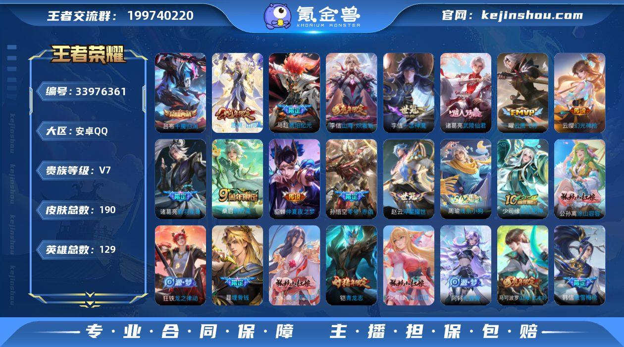 实名: 可修改 性别: 男号 贵族等级: V7 英雄数: 129 皮肤数: 190 荣耀水晶: 千魇归渊 传说皮: 云鹰飞将,一念神魔,仲夏夜之梦,零号·赤焰,淬星耀世,山海·炽霜斩,鹤羽星尊,琥珀纪元马超,幻光神枪 限定皮: 游园惊梦,梁祝,天狼狩猎者,青龙志,武陵仙君,如梦令-后羿,傲雪梅枪,山海·玄木吟,鸣野蒿,逐霄战戟,愿照·山河定 亮点: 【优质装备】:云鹰飞将(小将军),一念神魔,仲夏夜之梦(大飞蛾),零号·赤焰,淬星耀世,山海·炽霜斩(李信年限),鹤羽星尊,琥珀纪元马超,涂山容容