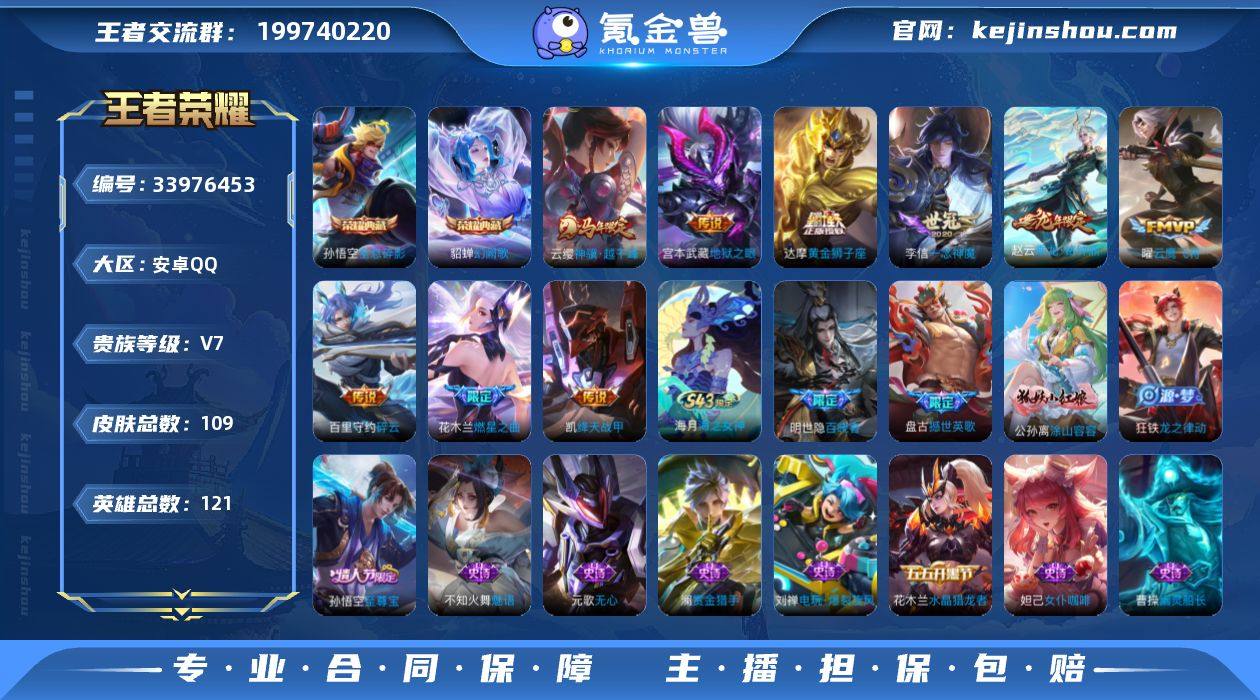 【王者荣耀】珍品无双0 典藏2 无双0 珍品传说0 传说11 史诗33 英雄121 皮肤109 贵族7级 荣耀典藏:全息碎影|幻阙歌__传说皮肤:绛天战甲|地狱之眼|黄金狮子座|狄仁杰-超时空战士|一念神魔|云鹰飞将|燃星之曲|碎云|周瑜-音你心动|乘龙·铭钟鼎|神骥·越千峰__稀有限定:至尊宝|海滩派对|皇家上将|魔术师|奇幻香踪|擒涛扼浪|探海日志|无心|阴阳师|驭风魔法|缤纷独角兽|乘风破浪|电玩·爆裂旋风|功夫厨神|鬼剑武藏|节奏热浪|金属风暴|魅力维加斯|魅语|女仆咖啡|赏金猎手|圣诞狂欢|水果甜心|水晶猎龙者|赵云-未来纪元|鹰眼统帅|幽灵船长|逐浪之夏|噬灭天穹|心灵战警|千年之狐|刘备-百相守梦|玲珑珍味|龙之律动|虚灵犬护|逆浪荇歌|涂山容容|荣光之誓|小乔-线条小狗|周瑜-线条小狗|撼世英歌|百晓客|海之女神__优质皮肤:尼罗河女神|孤猎|碧珀绯影|超能战警|启蛰|幸存者|福禄兄弟|隐刃|前尘|精灵王|龙域领主|棒球奇才|蔷薇王座|战争女神|加勒比小姐|精灵公主|功夫炙烤|潮玩探月行|守护之力|阿尔法小队|兔女郎|死亡骑士|天使之翼|玩偶对对碰|忍·炎影|街头霸王|零食大作战|西部游侠|牛运亨通|拳王|白色死神|星梦巡礼|雾都夜雨|乱世虎臣|经纬探寻者|牛魔-西部大镖客|汉昭烈帝|万事如意|花好人间...