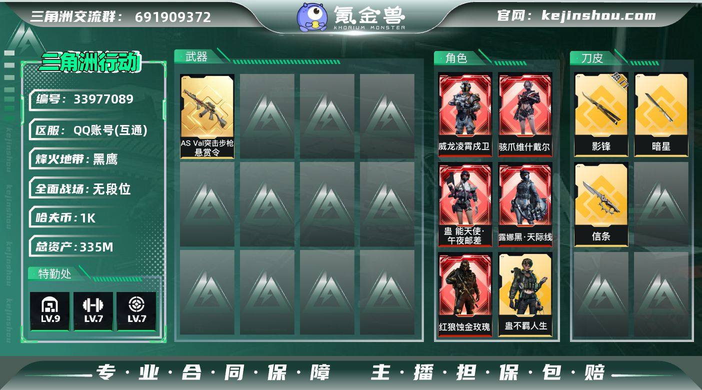 【SJZD4154】总资产335M/哈夫币0万/行动等级60/安全箱等时效性道具以游戏内数据为准,详情请看图/红狼-蚀金玫瑰/露娜-黑·天际线/蛊-能天使·午夜邮差/骇爪-维什戴尔/威龙-凌霄戍卫/威龙-壮志凌云(S3)/无名-夜鹰(S4)/深蓝-不破誓约(S6)/乌鲁鲁-荒原猎手/露娜-金牌射手(S7)/蛊-不羁人生/蜂医-送葬人·无题密令(S5)/近战-影锋/近战-信条/近战-暗星/AS Val突击步枪-悬赏令