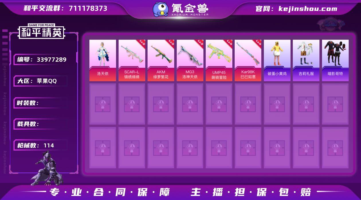 苹果Q 可二次 1粉装6特效枪85套装114枪皮 洛天依 SCAR-L-锦绣绵绵(5级) AKM-绿萝繁花(5级) Kar98K-巳巳如意(4级) MG3-洛神天依(5级) Mk14-福马献瑞(4级) UMP45-萌骑冒险(4级) 暗影哥特 破蛋小黄鸡 M762-奇异狩猎者 和平精英账号