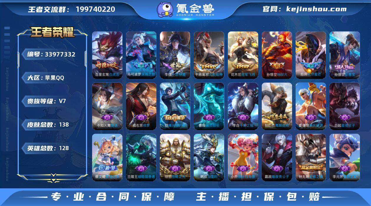 V7 8传说 128英雄 138皮肤 可二次 可修改实名 男号 【英雄全皮】孙权全皮,大禹全皮 【稀有英雄】大司命,嬴政(始皇帝),韩信(韩跳跳),夏洛特(夏师傅),艾琳,橘右京(橘子),娜可露露(鸟人),不知火舞,赵云,金蝉(唐僧),戈娅 【传说皮】神骥·赴朔漠,地狱火,一念神魔,冠军飞将,久胜战神 【赛季/战令皮】古海寻踪(s33),流音漫舞,天穹祈灯(s34),狮心王(s3),蜃楼王(s4),妖精王(s5),凯尔特女王(s7),狰(s8),烛龙(s10),重明(s11),穷奇(s12),御狮(s13),御霄(s14),御旌(s15),御銮(s16),朔风刀(s17),混沌棋(s18),疑决卦(s19),醍醐杖(s20),原初探秘者(s21),万华元夜(s22),演武夺筹(s23),驱傩正仪(s24),千军破阵(s25),猎兽之王,西部大镖客-猪八戒,暗影游猎(游乐娃子),潮玩骑士王,星际陆战队-达摩,沙漠行僧(s26),午后时光,大漠名商(s28) 【史诗皮】线条小狗-小乔,线条小狗-周瑜,海之女神,遇见神鹿,苍穹之光,白龙吟,千年之狐,偶像歌手,魅语,修罗,天才门将,星夜王子,暗隐猎兽者,幽灵船长,繁星吟游(呼啦呼啦),缤纷独角兽,乘风破浪,逐浪之夏,曙光守护者,鹰眼统帅,王者之锤,暗夜贵公子,魅力维加斯,千筹问战 【限定皮】至尊宝,白虎志(电光耗子),李小龙,朱雀志(守约年限),默契交锋-花木兰,无尽星芒,深海之...
