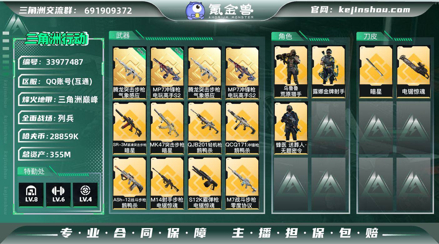 QQA90/可二次/QQ区【356.4M总资产】+【腾龙突击步枪-气象感应(毒性优品c)+【MP7冲锋枪-电玩高手S2(优品c)+【近战-暗星-处刑者-电锯惊魂】+S8赛季安全箱3*3+24发AWM子弹】/烽火等级:60级/全面战场:10级/纯币:28859K/三角券加币:1360(三角币1360+三角券0)【峰医-送葬人】【乌鲁鲁-荒原猎手】【露娜-金牌射手】/部门:22322/特勤等级(技术中心满级/工作台满级/制药台满级/防具台满级/仓库8级/指挥中心5级/训练中心6级/靶场4级/潜水中心2级/收藏室1级)(流动资产:144.7M)---(锦绣+鹅鸭杀+捞点薯条+特拉斯线圈+马年祥瑞+缄花+暗星)捆绑包---/SCAR-H战斗步枪-启航/M4A1突击步枪-阿米娅/勇士冲锋枪-能天使-午夜邮/腾龙突击步枪-捞点薯条/AWM狙击步枪-捞点薯条/R93狙击步枪-维什戴尔/CAR-15突击步枪-阿米娅/复合弓-黑-天际线/11橙色挂饰/段位:三角洲巅峰/详细看图