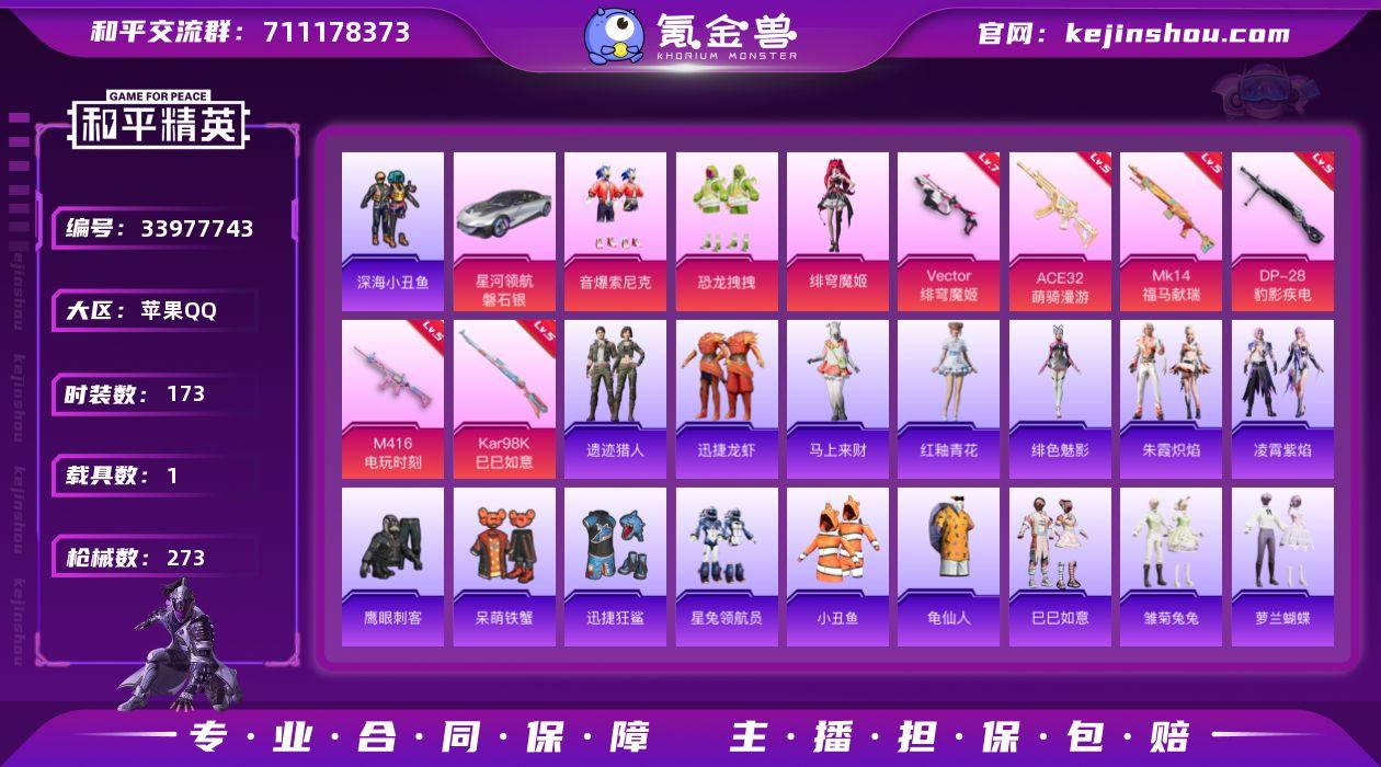 【LHPX2774】精品小号 19印记【特价出售/店主推荐--热门套装小丑鱼】苹果手Q-3粉装-6特效枪-1载具-1粉色飞行器-76881热力值-19王牌印记-173套装-273枪皮【热门品类】:粉装-音爆索尼克,套装-深海小丑鱼,套装-小丑鱼,套装-龟仙人【粉色套装】:粉装-恐龙拽拽,粉装-音爆索尼克,角色-绯穹魔姬【粉色枪皮等级】:M416-电玩时刻(五级),ACE32-萌骑漫游(五级),Vector-绯穹魔姬(七级),Kar98K-巳巳如意(五级),Mk14-福马献瑞(五级),DP-28-豹影疾电(五级)【粉色载具】:星河领航(磐石银)【粉色枪皮】:M416-电玩时刻,ACE32-萌骑漫游,Vector-绯穹魔姬,Kar98K-巳巳如意,Mk14-福马献瑞,DP-28-豹影疾电【粉色飞行器】:太空嘟嘟飞行器