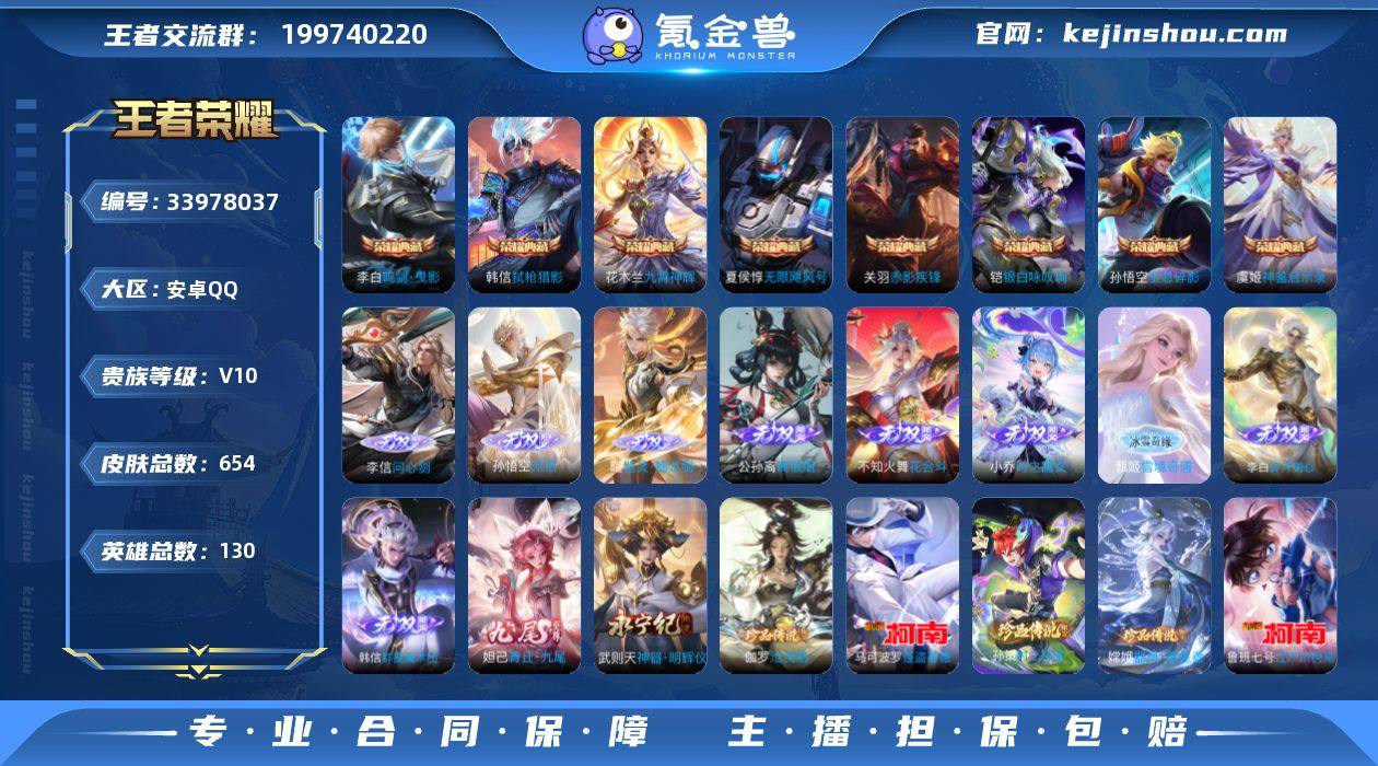 MM613,营地ID:361593046,营地无法登陆被封10年无法转区,【英雄数量】130【皮肤数量】654【区服】,安卓QQ,32区【场次】20412【胜率】49.85%【段位】最强王者【贵族等级】10【稀有英雄】11,,_敖隐,_武则天,_金蝉,_艾琳,_夏洛特,_娜可露露,_橘右京,_韩信,_不知火舞,_嬴政,_赵云,【皮肤价值】695364,【内测皮肤】5,钟馗_锁墨魂,姬小满_妄想食味,高渐离_玩趣恶龙,孙尚香_蔷薇恋人,艾琳_女武神【荣耀皮肤】9,虞姬_神鉴启示录,韩信_弑枪猎影,铠_银白咏叹调,关羽_赤影疾锋,花木兰_九霄神辉,李白_鸣剑曳影,武则天,夏侯惇_无限飓风号,孙悟空_全息碎影【珍品无双】0,【无双皮肤】11,李信_问心剑,曜_器灵螭龙剑,孙悟空_无相,甄姬_雪境奇遇,公孙离_离恨烟,不知火舞_花合斗,韩信_群星魔术团,小乔_时之魔女,李白_碎月剑心,妲己_青丘九尾,武则天_神器明辉仪,【珍品传说】5,伽罗_沧流箭,嫦娥_器灵落星盏,孙策_时之奇旅,鲁班七号_江户川柯南,马可波罗_怪盗基德,【星元皮肤】0【传说皮肤】111,阿轲_罗刹妄海,貂蝉_神骥聚万邦,狄仁杰_神骥赴朔漠,云缨_神骥越千峰,马超_神骥逐星野,关羽_神骥镇沧海,王昭君_长夜焕生,后羿_神树通天,...