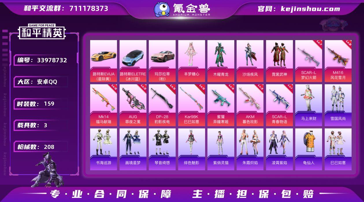 【LHPX2738】精品小号【特价出售/店主推荐】安卓手Q-4粉装-9特效枪-3载具-2粉色飞行器-66210热力值-17王牌印记-159套装-208枪皮【热门品类】:套装-龟仙人【粉色套装】:粉装-木曜青龙,粉装-沙场疾风,粉装-霓裳武神,角色-羊梦糖心【粉色枪皮等级】:AKM-暮色玫影(三级),SCAR-L-梦幻火箭(七级),SCAR-L-青春物语(一级),M416-风花雪月(六级),AUG-罪夜之冕(五级),蜜獾-异瞳寒姬(四级),Kar98K-巳巳如意(五级),Mk14-福马献瑞(五级),DP-28-豹影疾电(五级)【粉色载具】:路特斯EVIJA(星际黄),路特斯ELETRE(冰川蓝),玛莎拉蒂Ghibli(粉)【粉色枪皮】:AKM-暮色玫影,SCAR-L-梦幻火箭,SCAR-L-青春物语,M416-风花雪月,AUG-罪夜之冕,蜜獾-异瞳寒姬,Kar98K-巳巳如意,Mk14-福马献瑞,DP-28-豹影疾电【粉色飞行器】:炫彩糖果飞行器,梦幻火箭飞行器