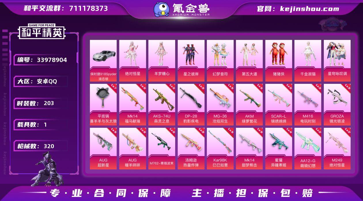 安卓 手Q-8粉装-19特效枪-1载具-5粉色飞行器-94370热力值-18王牌印记-203套装-320枪皮 【热门品类】:套装-龟仙人,套装-潮萌小黄鸭 【粉色套装】:角色-绝对恒星,粉装-星之彼岸,粉装-幻梦音符,粉装-第五大道,玩偶服-猪猪侠,角色-千金淑猫,粉装-星穹咏叹调,角色-羊梦糖心 【粉色枪皮等级】:AKM-绿萝繁花(五级),SCAR-L-锦绣绵绵(五级),M416-电玩时刻(五级),GROZA-镜光银凌(五级),AUG-星之彼岸(一级),AUG-超新星(五级),AUG-暖羊咩咩(五级),M762-青锋波束(五级),蜜獾-异瞳寒姬(四级),汤姆逊-热量炸弹(五级),AKS-74U-森灵之息(五级),Kar98K-巳巳如意(五级),Mk14-甜梦熊击(五级),Mk14-福马献瑞(五级),AA12-G-萌骑幻想(二级),M249-绝对恒星(二级),DP-28-豹影疾电(五级),MG-36-沧焰双生(五级),平底锅-喜羊羊与灰太狼(七级) 【粉色载具】:保时捷918 Spyder(液态银) 【粉色枪皮】:AKM-绿萝繁花,SCAR-L-锦绣绵绵,M416-电玩时刻,GROZA-镜光银凌,AUG-星之彼岸,AUG-超新星,AUG-暖羊咩咩,M762-青锋波束,蜜獾-异瞳寒姬,汤姆逊-热量炸弹,AKS-74U-森灵之息,Kar98K-巳巳如意,Mk14-甜梦熊击,Mk14-福马献瑞,AA12-G-萌骑幻想,M249-绝对恒星,DP-28-豹...