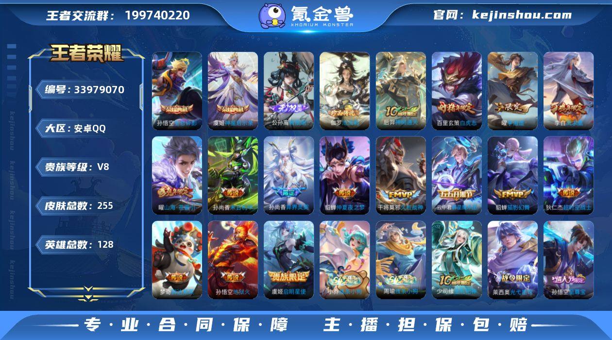 实名: 可修改 性别: 男号 贵族等级: V8 英雄数: 128 皮肤数: 255 荣耀水晶: 全息碎影,神鉴启示录 无双皮: 离恨烟 珍品传说: 沧流箭 传说皮: 猫影幻舞,久胜战神,末日机甲-孙尚香,地狱火,仲夏夜之梦,胖达荣荣,李逍遥,超时空战士-狄仁杰,山海·苍雷引,云中君群星魔术团,神树通天 限定皮: 遇见飞天,李小龙,梁祝,引擎之心,龙胆,辉光之辰,异界灵契-孙尚香,飞衡,天狼狩猎者,热情桑巴,凤求凰,美猴王,白虎志,至尊宝,默契交锋-花木兰,时之祈愿-云中君 亮点: 【优质装备】:全息碎影(猴子典藏),神鉴启示录,离恨烟(公孙离无双),猫影幻舞,久胜战神,末日机甲-孙尚香(绿蚂蚱),地狱火,仲夏夜之梦(大飞蛾),胖达荣荣,李逍遥,超时空战士-狄仁杰,山海·苍雷引(电光曜子),云中君群星魔术团,沧流箭