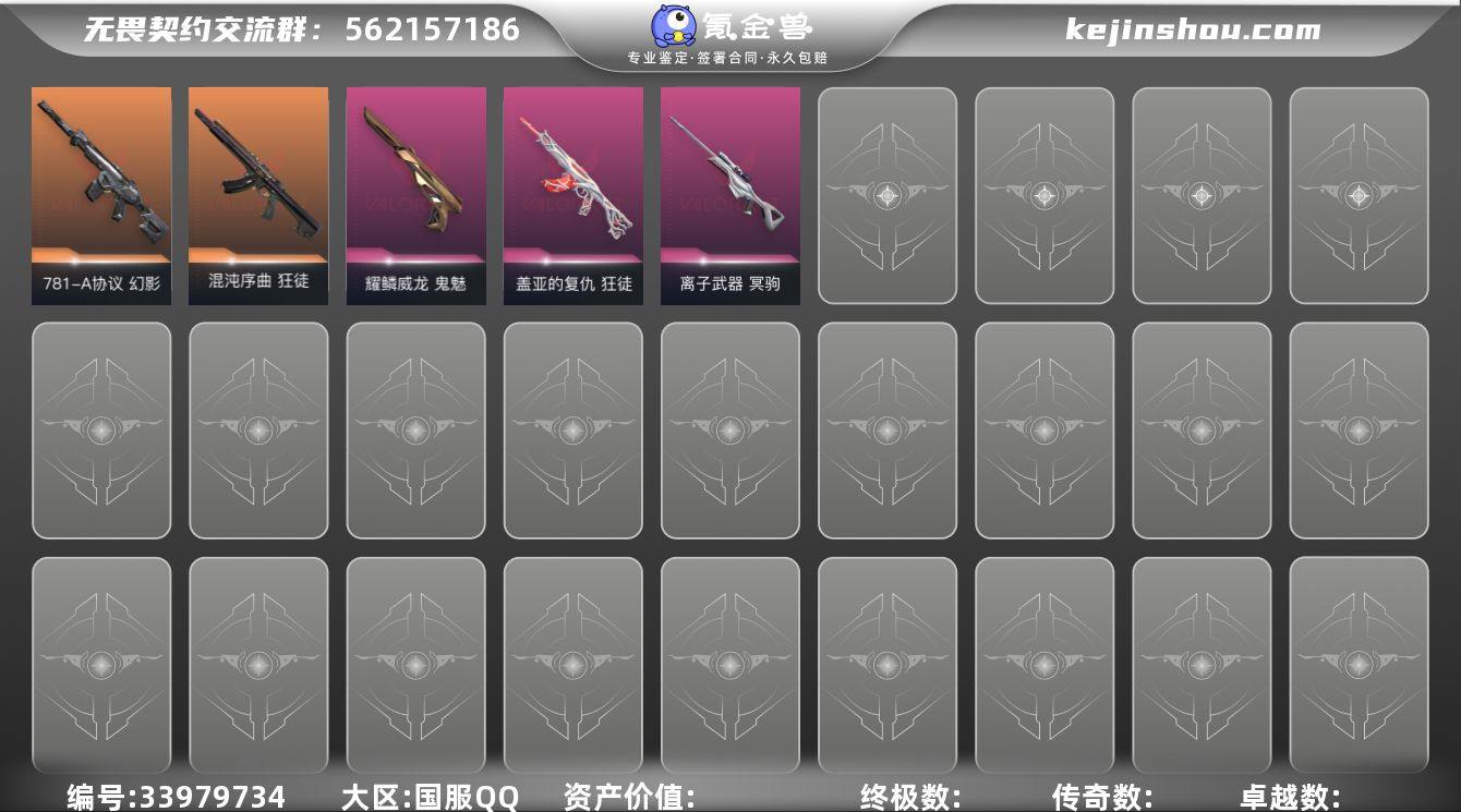 【sf857】【英雄】:幻棱,炼狱,维斯,暮蝶,铁臂,捷风,雷兹,不死鸟,贤者,猎枭,零,芮娜,尚勃勒,霓虹,夜露,星礈,海神,钢锁 【近战武器】:近战武器-穿花蝴蝶,近战武器-威龙之刃,近战武器-荒土机兵 热能刀 【狂徒】:狂徒-混沌序曲,狂徒-奇点//2.0,狂徒-盖亚的复仇,狂徒-荒土机兵 【幻影】:幻影-ORA x 颗秒,幻影-781-A协议,幻影-纳米打击 【戍卫】:戍卫-逆冲蛮牛 【獠犬】:獠犬-逆冲蛮牛 【冥驹】:冥驹-离子武器,冥驹-荒土机兵 【莽侠】:莽侠-RGX 11z Pro//3.0 【奥丁】:奥丁-纳米打击 【判官】:判官-纳米打击x 【雄鹿】:雄鹿-逆冲蛮牛 【骇灵】:骇灵-荒土机兵 【标配】:标配-荒土机兵 【正义】:正义-奇点,正义-纳米打击 【鬼魅】:鬼魅-耀鳞威龙,鬼魅-诡秘蛇影,鬼魅-缄默者,鬼魅-星云暗涌 【狂怒】:狂怒-蒙太奇,狂怒-逆冲蛮牛
