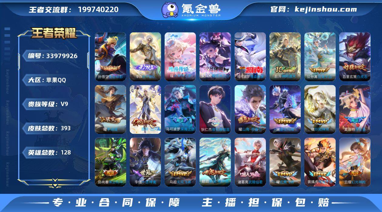 AL707180 【捡漏速来!性价比超高王者成品号】 皮肤数393 无双皮肤数1 传说皮肤数34 珍品传说皮数3 史诗皮肤数120 英雄数128 营地id1877845159 贵族等级【文本】贵族9级 【贵族9级】 【是】 【否】 【启用】 【是】 【是】 【否】 【QQ平台】 【支持】 【iOS】 【找回包赔】 【不接受还价】 【商家商品编号】 荣耀典藏1 无双皮肤1 珍品传说3 内测皮肤4 年限皮肤11 限定皮肤131 赛季限定30 史诗皮肤121 战令限定34 勇者皮肤165 其他皮肤68 荣耀典藏:孙悟空全息碎影; 无双皮肤:李白碎月剑心; 珍品传说:安琪拉酷洛米之心,瑶大耳狗之梦,马可波罗怪盗基德; 内测皮肤:高渐离玩趣恶龙,姬小满妄想食味,艾琳女武神,孙尚香蔷薇恋人; 年限皮肤:司空震愿照山河定,赵云乘龙铭钟鼎,典韦岱宗,黄忠烈魂,赵云龙胆,瑶山海碧波行,曜山海苍雷引,韩信飞衡,马可波罗山海玄木吟,百里玄策白虎志,铠青龙志; 限定皮肤:百里玄策罗小黑战记,高渐离玩趣恶龙,女娲万灵启世,张良罗小黑战记,鬼谷子克喵,白起死霸装,后羿石田雨龙,扁鹊灵蛊蚀心,姬小满小满鸭,百里玄策原初追逐者,阿古朵布丁狗之约,安琪拉酷洛米之心,瑶大耳狗之梦,狂铁龙之律动,苏烈春野闲踪,钟馗虚灵犬...