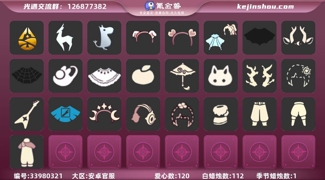 【A1224】区服:国服安卓官服,登入方式:邮箱【7季卡】巫师帽鹿角蝙蝠斗蜘蛛斗白雪斗红伞秋千茶桌正太头,蜡烛数量:112,爱心:120,当前身高1.628,最高身高1.559,最矮身高13.559,已经毕业地图:雨林,霞谷,暮土,已经毕业季节:姆明季,九色鹿季,归巢季,稀有礼包:玉兔拖鞋,雪人暖心靴,星月头冠,神鹿祝福头饰,彩虹耳机,金鳞耳坠,巫术犄角,圣诞鹿角,优雅领结,巫师帽,南瓜头,贝壳,雪花发卡,玉兔,大桔大利,四叶草头饰,小狗周年头饰,锦标赛桂冠,心心相印发饰,tgc,蜘蛛斗篷,蝙蝠斗篷,白雪斗篷,周年庆吉他,祥云瑞气纸伞,狐狸背包,情人秋千,茶桌,冥龙南瓜,蝴蝶与花,绿绒绒卷耳头饰,雪人头饰,粽子头饰,小黄鸭头饰,猫耳尾套装,青衫落拓礼包,瑞雪围巾斗篷,热门物品:蝴蝶结,公主头,正太头,樱花头,猫猫头,武士裤,白棉裤,背带裤,花环头饰,宴会围巾,虚荣发型,红耳机,黄鼠狼面具,红狐狸面具,花瓣斗篷,灯泡斗篷,红金斗篷,白金斗篷,吉他,高音钢琴,笛子,雨伞