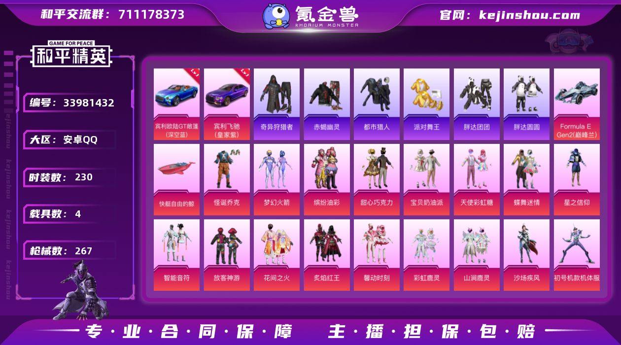 安卓手Q-2红车宾利!男神身法套!小丑!和服!26粉装-12特效枪-4载具+1僚机-5粉色飞行器-104775热力值-12王牌印记-230套装-267枪皮 【红色载具】:宾利飞驰(皇家紫)(一级),宾利欧陆GT敞篷(深空蓝)(一级) 【热门品类】:粉装-怪诞乔克,粉装-梦幻火箭,粉装-缤纷油彩,套装-浪漫天命,套装-赤蝎幽灵,套装-都市猎人,套装-派对舞王,套装-小丑鱼,套装-奇异狩猎者,套装-胖达团团,套装-胖达圆圆,角色-2B战斗服款,套装-龟仙人,套装-暗影哥特,套装-粉红小猪,套装-萌熊伴侣,套装-红红火火 【粉色套装】:粉装-怪诞乔克,粉装-甜心巧克力,粉装-宝贝奶油派,粉装-天使彩虹糖,粉装-蝶舞迷情,粉装-梦幻火箭,粉装-星之信仰,粉装-智能音符,粉装-缤纷油彩,粉装-放客神游,粉装-花间之火,粉装-炙焰红王,粉装-馨动时刻,粉装-彩虹鹿灵,粉装-山涧鹿灵,粉装-沙场疾风,角色-初号机款机体服,粉装-精灵娃娃,粉装-酣梦娃娃,粉装-焦糖拿铁,粉装-第五大道,粉装-纯珍童话,粉装-瑰丽时代,粉装-黄族统领,粉装-天星战神,角色-萨利娅 【粉色枪皮等级】:AKM-炫紫旋律(五级),SCAR-L-纯梦嫁纱(三级),M416-心之恋语(一级),M416-风花雪月(五级),M762-冷魅冰骑(三级),P...