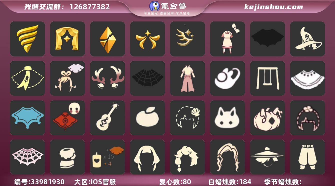 账号类型: 邮箱账号 季节已毕业: 潜海季,表演季,破晓季,欧若拉季,迁徙季 完成地图: 晨岛,云野,雨林,霞谷,暮土,禁阁 珍稀物品: 白枭,透明蝶翼斗 礼包: 蝙蝠套,巫师,围巾,绊爱,鹿角,蜘蛛斗,牛仔裤,兔子鞋,秋千,白绒金,瑞雪,福娃,吉他,橘子,贝壳,兔子,南瓜,四叶草,透明蛛丝,雪人鞋,创始人,爱丽丝围裙套装礼包 裤子: 武士裤,背带裤,蓝绿裤 面具: 呼吸面具,黄眉企鹅面具 面饰: 红耳机 发型: 若笠,虚荣,单侧绑发,留辫蘑菇头 头饰: 蓝色音乐会,平顶帽 斗篷: 黄色蓑衣,海洋斗,绿芽,遥鲲斗篷,燕尾斗篷,冥龙斗篷,领主红斗篷,瑞雪斗篷 配饰: 雨伞,高音钢琴 亮点: 【优质装备】:表演季,白枭(帝企鹅发),武士裤,潜海季,破晓季,透明蝶翼斗,欧若拉季(欧若拉),高音钢琴(白色高脚钢琴),蓝绿裤(高领舞服),呼吸面具(潜水面具),黄眉企鹅面具,单侧绑发(单边小辫),留辫蘑菇头,遥鲲斗篷(双翼遥鲲斗),燕尾斗篷,冥龙斗篷,领主红斗篷(暗红斗篷),蝙蝠套(蝙蝠斗篷)(南瓜头),福娃(福娃礼包)(春之日礼包)(铜钱斗),绊爱(绊爱斗篷)(绊爱礼包),秋千(情人秋千),红耳机,围巾(小王子斗篷)(小王子围巾),鹿角(圣诞鹿角),蜘蛛斗(蛛丝斗篷)(蛛网斗篷),瑞雪(瑞雪斗篷)(暖冬瑞雪),吉他(音韵吉他)(白吉他),透明蛛丝(透明蜘...