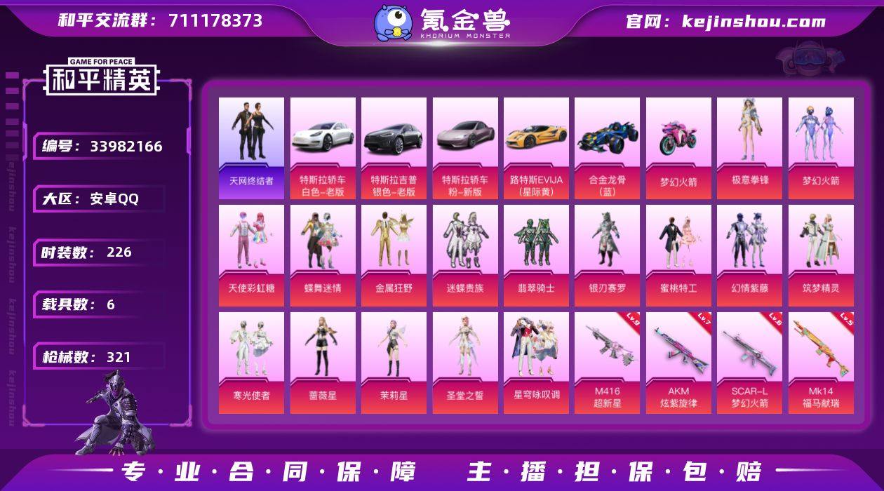 安卓手Q-天网终结者-巡查衣-追光服-粉熊包-9级m4超新星-16粉装-10特效枪-6载具-8粉色飞行器-117408热力值-24王牌印记-226套装-321枪皮 【热门品类】:粉装-梦幻火箭,绝对防御上衣,套装-浪漫天命,角色-军刀雅典娜,套装-天网终结者,套装-龟仙人,套装-潮萌小黄鸭,套装-暗影哥特,套装-浪漫波比 【粉色套装】:粉装-天使彩虹糖,粉装-蝶舞迷情,粉装-梦幻火箭,粉装-金属狂野,粉装-迷蝶贵族,粉装-翡翠骑士,粉装-银刃赛罗,粉装-蜜桃特工,粉装-幻情紫藤,粉装-筑梦精灵,粉装-寒光使者,角色-蔷薇星,角色-茉莉星,角色-圣堂之誓,粉装-星穹咏叹调,粉装-极意拳锋 【粉色枪皮等级】:AKM-炫紫旋律(七级),SCAR-L-梦幻火箭(六级),M416-心之恋语(一级),M416-超新星(九级),蜜獾-异瞳寒姬(二级),AKS-74U-星穹咏叹调(二级),Kar98K-巳巳如意(五级),Mk14-福马献瑞(五级),DP-28-豹影疾电(五级),MG3-酷泡奶龙(五级) 【粉色载具】:特斯拉Model 3(珍珠白),特斯拉Model X(冷光银),特斯拉Roadster(沁心粉),路特斯EVIJA(星际黄),合金龙骨(蓝),双人摩托-梦幻火箭,空客H135-蔚蓝之翼 【粉色枪皮】:AKM-炫紫旋律,SCAR-L-梦幻火箭,M416-心之恋语,M416-超新星...