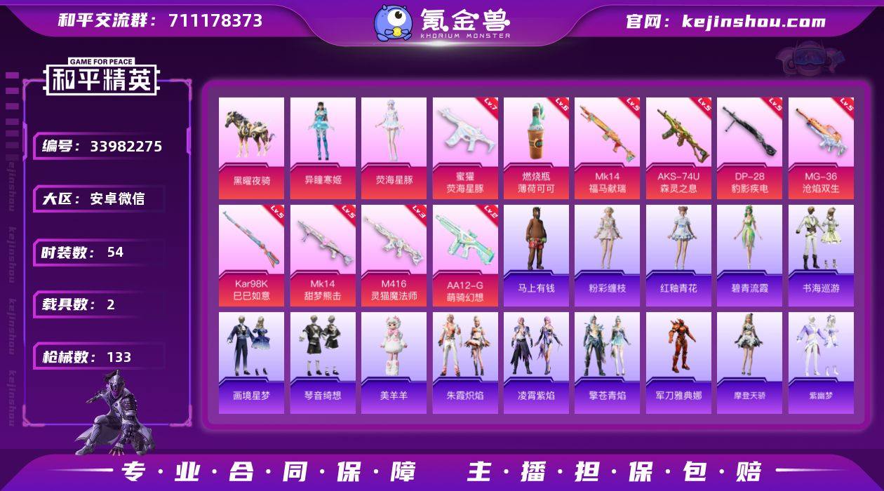 安卓微信 S2-GWM220【黑曜夜骑/霜月冰狼马皮】【1神装2粉装11特效枪2载具3粉色飞行器 一级尼诺 军刀雅典娜/荧海星豚/异瞳寒姬/时希公主/蜜露汐语/蓝海鲸歌/美羊羊/碧青流霞】36633热力值-4王牌印记-54套装-133枪皮 【红色神装等级】:霜月狼主-尼诺(一级) 【红色角色神装】:霜月狼主-尼诺 【热门品类】:角色-军刀雅典娜 【粉色套装】:角色-荧海星豚,角色-异瞳寒姬 【粉色枪皮等级】:UMP45-霜月狼主(三级),M416-灵猫魔法师(三级),蜜獾-荧海星豚(七级),AKS-74U