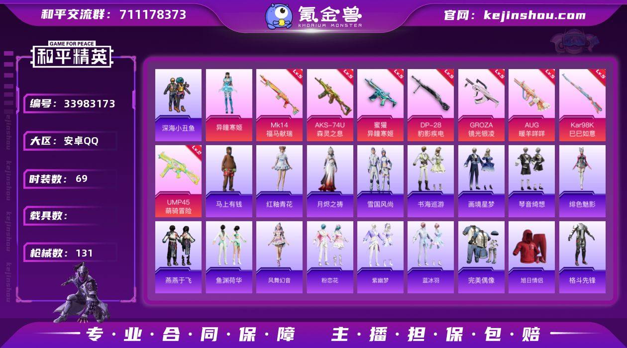 安卓 手Q-1粉装-8特效枪-0载具-2粉色飞行器-31896热力值-5王牌印记-69套装-131枪皮 【热门品类】:套装-深海小丑鱼 【粉色套装】:角色-异瞳寒姬 【粉色枪皮等级】:GROZA-镜光银凌(五级),AUG-暖羊咩咩(五级),蜜獾-异瞳寒姬(五级),UMP45-萌骑冒险(二级),AKS-74U-森灵之息(五级),Kar98K-巳巳如意(五级),Mk14-福马献瑞(五级),DP-28-豹影疾电(五级) 【粉色枪皮】:GROZA-镜光银凌,AUG-暖羊咩咩,蜜獾-异瞳寒姬,UMP45-萌骑冒险,AKS-74U-森灵之息,Kar98K-巳巳如意,Mk14-福马献瑞,DP-28-豹影疾电 【粉色飞行器】:炫彩糖果飞行器,极意拳锋飞行器 【粉色降落伞】:洛神天依降落伞,闲梦青缨降落伞,千金淑猫降落伞,星穹咏叹调降落伞,异瞳寒姬降落伞,炫彩糖果降落伞 【稀有套装】:套装-雪国风尚,套装-炫彩糖果,套装-马上有钱,套装-燕燕于飞,套装-鱼渊荷华,套装-风舞幻音,套装-粉恋花,套装-紫幽梦,套装-蓝冰羽,角色-绯色魅影,套装-书海巡游,套装-画境星梦,套装-琴音绮想,角色-月烬之祷,套装-雨过天青,套装-红釉青花 【稀有枪皮】:AUG-冰晶雪宝,AKM-星之彼岸,AKM-环太平洋,AKM-破晓战魂,AKM-龙的传人,M16A4-红色方程式,SCAR-L-夜灯,SCAR-L-炫...