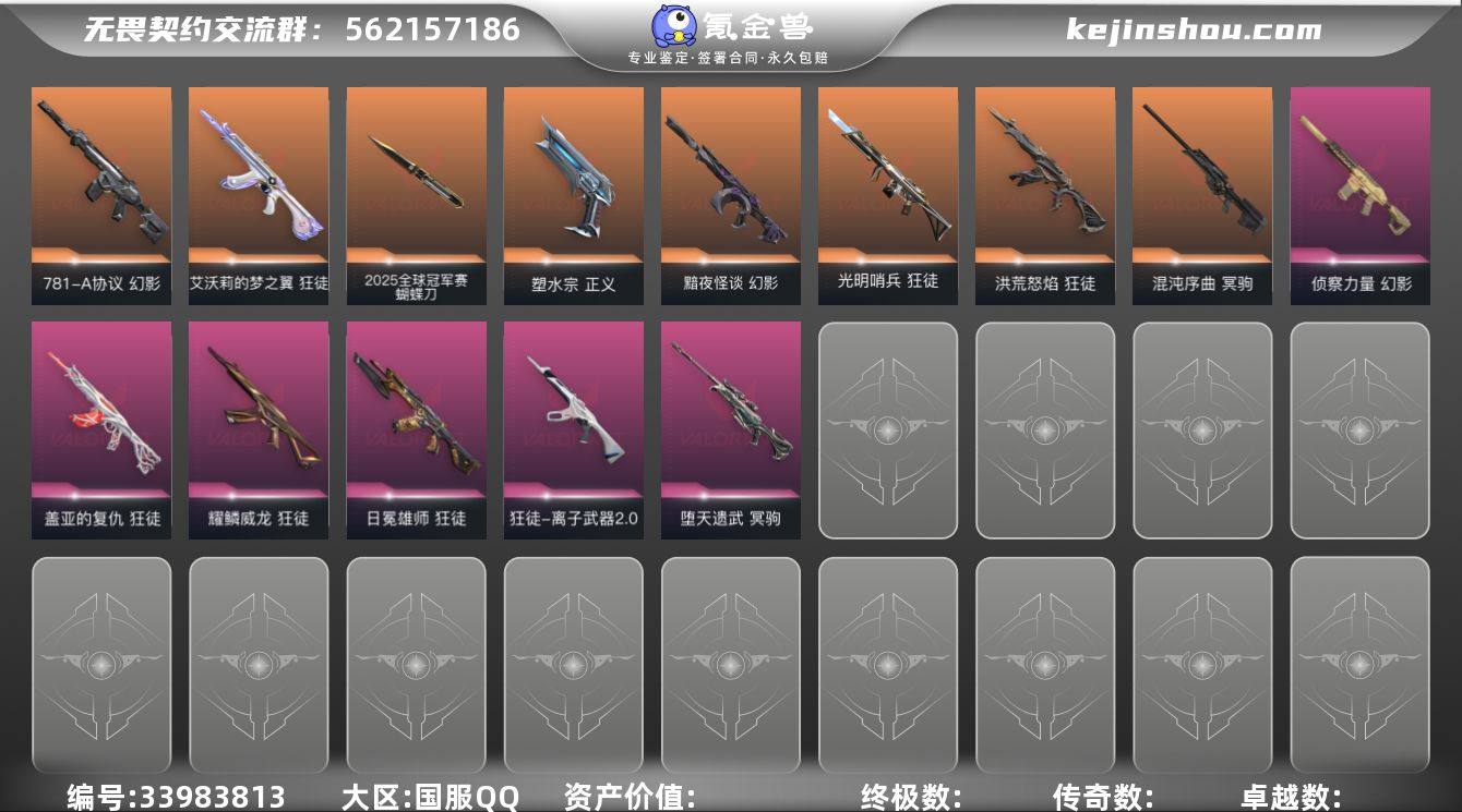 【sf869】【套装】:2025全球冠军赛套装,2022全球冠军赛套装,西部未来套装,VCTxEDG 队伍套装 【英雄】:幻棱,炼狱,维斯,暮蝶,钛狐,壹决,铁臂,捷风,雷兹,幽影,不死鸟,贤者,猎枭,蝰蛇,零,芮娜,奇乐,尚勃勒,霓虹,斯凯,夜露,星礈,K/O,海神,盖可,黑梦,钢锁 【近战武器】:近战武器-2025全球冠军赛 蝴蝶刀,近战武器-2022全球冠军赛 蝴蝶刀,近战武器-艾沃莉的魔法棒,近战武器-澄湖潋滟,近战武器-未来开拓者,近战武器-超能偶像 应援棒,近战武器-诡秘蛇影 军刀 【狂徒】:狂徒-2025全球冠军赛,狂徒-光明哨兵,狂徒-洪荒怒焰,狂徒-艾沃莉的梦之翼,狂徒-盖亚的复仇,狂徒-日冕雄师,狂徒-耀鳞威龙,狂徒-离子武器//2.0,狂徒-超能偶像,狂徒-诡秘蛇影 【幻影】:幻影-2022全球冠军赛,幻影-黯夜怪谈,幻影-西部未来,幻影-781-A协议,幻影-侦察力量,幻影-聚合之力,幻影-末日之翼,幻影-西部未来 【戍卫】:戍卫-超能偶像,戍卫-折光棱晶 【獠犬】:獠犬-采蜜小蜂队 【冥驹】:冥驹-混沌序曲,冥驹-堕天遗武 【飞将】:飞将-西部未来,飞将-聚合之力,飞将-末日之翼 【莽侠】:莽侠-诡秘蛇影 【战神】:战神-采蜜小蜂队 【奥丁】:奥丁-西部未来...