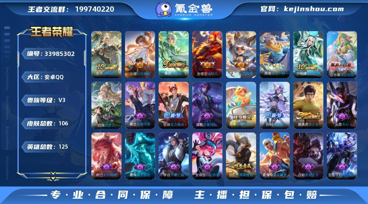 安卓Q-V3-最强王者段位-125英雄-106皮肤-5传说-27史诗【传说皮肤】:后羿神树通天,云缨幻光神枪,桑启鸣野蒿,李元芳飞鸢探春,孙悟空地狱火【限定皮肤】:狄仁杰阴阳师,庄周高山流水,高渐离玩趣恶龙,元歌无心,狄仁杰万华元夜,老夫子醍醐杖,程咬金演武夺筹,钟馗驱傩正仪,鬼谷子原初探秘者,裴擒虎李小龙【赛季限定】:老夫子醍醐杖,鬼谷子原初探秘者,狄仁杰万华元夜,程咬金演武夺筹,钟馗驱傩正仪,太乙真人谧流熔炉,钟馗虚灵犬护,甄姬逆浪荇歌,亚瑟荣光之誓【战令限定】:刘禅鸭鸭历险记,沈梦溪鸭鸭历险记,周瑜线条小狗【史诗皮肤】:周瑜线条小狗,少司缘巫礼祀神,公孙离涂山容容,西施织梦人,黄忠百相守梦,扁鹊灵蛊蚀心,狂铁龙之律动,刘禅鸭鸭历险记,阿轲化蝶舞,元歌无心,庄周高山流水,裴擒虎李小龙,狄仁杰鹰眼统帅,伽罗箭羽风息,白起星夜王子,蔡文姬舞动绿茵,百里守约特工魅影,安琪拉心灵骇客,夏侯惇乘风破浪,李白千年之狐,曹操幽灵船长,墨子金属风暴,妲己女仆咖啡,妲己魅力维加斯,嬴政摇滚巨星,孙尚香水果甜心,宫本武藏鬼剑武藏,王昭君偶像歌手【其他皮肤】:影百相守梦,鲁班七号班班快跑,虞姬溯影追猎,蚩奼极光幻客,艾琳...