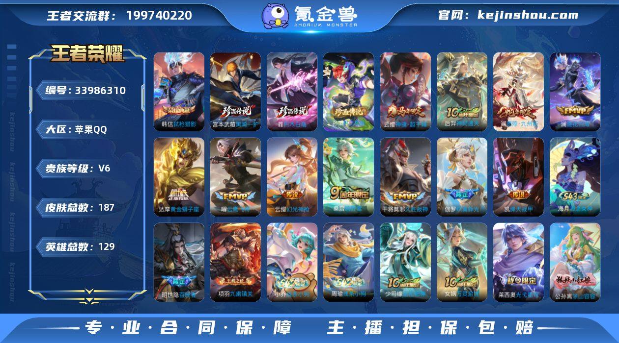 0BGFD3可二次水晶1珍品传说3传说11优质限定10 钱包已注销 信用分低于350 水晶皮肤:弑枪猎影, 珍品传说皮肤:时之奇旅-孙策,黑崎一护,朽木白哉, 新传说限定:神骥·越千峰, 传说限定:愿照·九州拓,炽翼辉光,神树通天, 传说皮肤:澜逐花归海,幻光神枪,黄金狮子座,绛天战甲,云鹰飞将,久胜战神,鸣野蒿, 新史诗限定:万灵启世,涂山容容,百晓客, 史诗限定:至尊宝,埋骨钱,器灵·浮梦炉, 新史诗皮肤:战舞者,星界特工,百相守梦-黄忠, 优质史诗皮肤:天秀·启明,怒海争锋,遇见神鹿, 周年皮肤:江河有灵,游园惊梦,鹤鸣心笺,神树通天, 珍宝阁:万物之道,蔷薇恋人, 史诗皮肤:地狱岩魂,星夜王子,末日机甲-吕布,无心,乘风破浪,幽灵船长,功夫厨神,水晶猎龙者,心灵战警,鬼剑武藏,千年之狐,暗隐猎兽者,冰冠公主,黎明之约,原初追逐者,缤纷独角兽,金属风暴,魅力维加斯,摇滚巨星,冰雪圆舞曲,圣诞恋歌,偶像歌手,月团寄思,水果甜心,电玩小子,鹰眼统帅,奇遇舞章,逐浪之夏,特工魅影,乱世虎臣, "