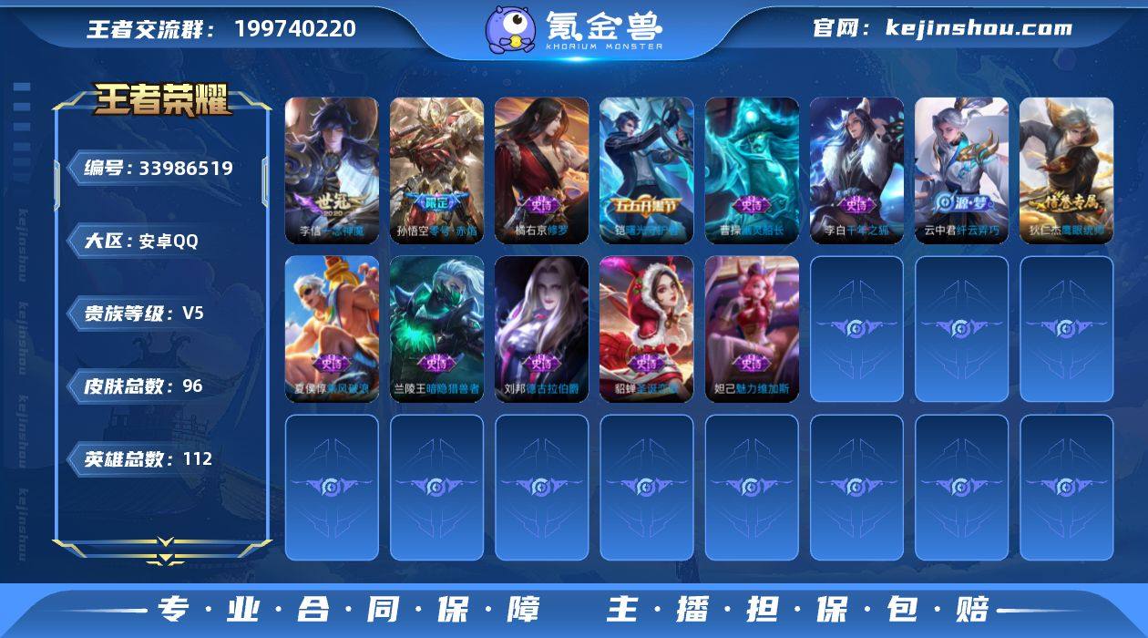 V5 3传说 112英雄 96皮肤 可二次 可修改实名 男号