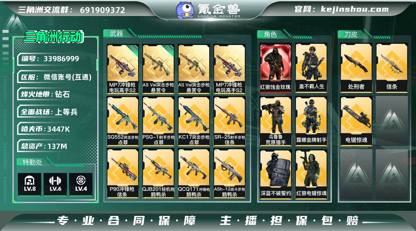 【SJZYH1843】总资产137M/哈夫币344万/传说近战数1/传说枪皮数41/战场等级50/行动等级60/安全箱等时效性道具以游戏内数据为准,详情请看图/红狼-蚀金玫瑰/深蓝-不破誓约(S6)/红狼-电锯惊魂/露娜-金牌射手(S7)/乌鲁鲁-荒原猎手/蛊-不羁人生/近战-信条/近战-电锯惊魂/近战-处刑者/近战-黑鹰/AS Val突击步枪-悬赏令/MP7冲锋枪-电玩高手S2/优品C典藏武器外观-AS Val突击步枪-悬赏令/优品B典藏武器外观-MP7冲锋枪-电玩高手S2/M4A1突击步枪-蚀金玫瑰/M4A1突击步枪-阿米娅/AKM突击步枪-锦绣/ASh-12战斗步枪-鹅鸭杀/AUG突击步枪-西装暴徒/M7战斗步枪-巳蛇/SG552突击步枪-运动员/SG552突击步枪-点翠/AK-12突击步枪-特斯拉线圈/SCAR-H战斗步枪-启航/SCAR-H战斗步枪-荼蘼/G3战斗步枪-骑士/腾龙突击步枪-捞点薯条/腾龙突击步枪-马年祥瑞/K437突击步枪-锦绣/KC17突击步枪-电锯惊魂/KC17突击步枪-点翠/P90冲锋枪-信条/UZI冲锋枪-特斯拉线圈/SMG-45冲锋枪-锦绣/SR-3M紧凑突击步枪-特斯拉线圈/SR-3M紧凑突击步枪-荼蘼/勇士冲锋枪-能天使-午夜邮差/QCQ171冲锋枪-鹅鸭杀/QCQ171冲锋枪-不羁人生/S12K霰弹枪-电锯惊魂/PKM通用机枪-荼蘼/M250通用机枪-骑士之心/QJB201轻机枪-鹅鸭杀/M14射手步枪-电...