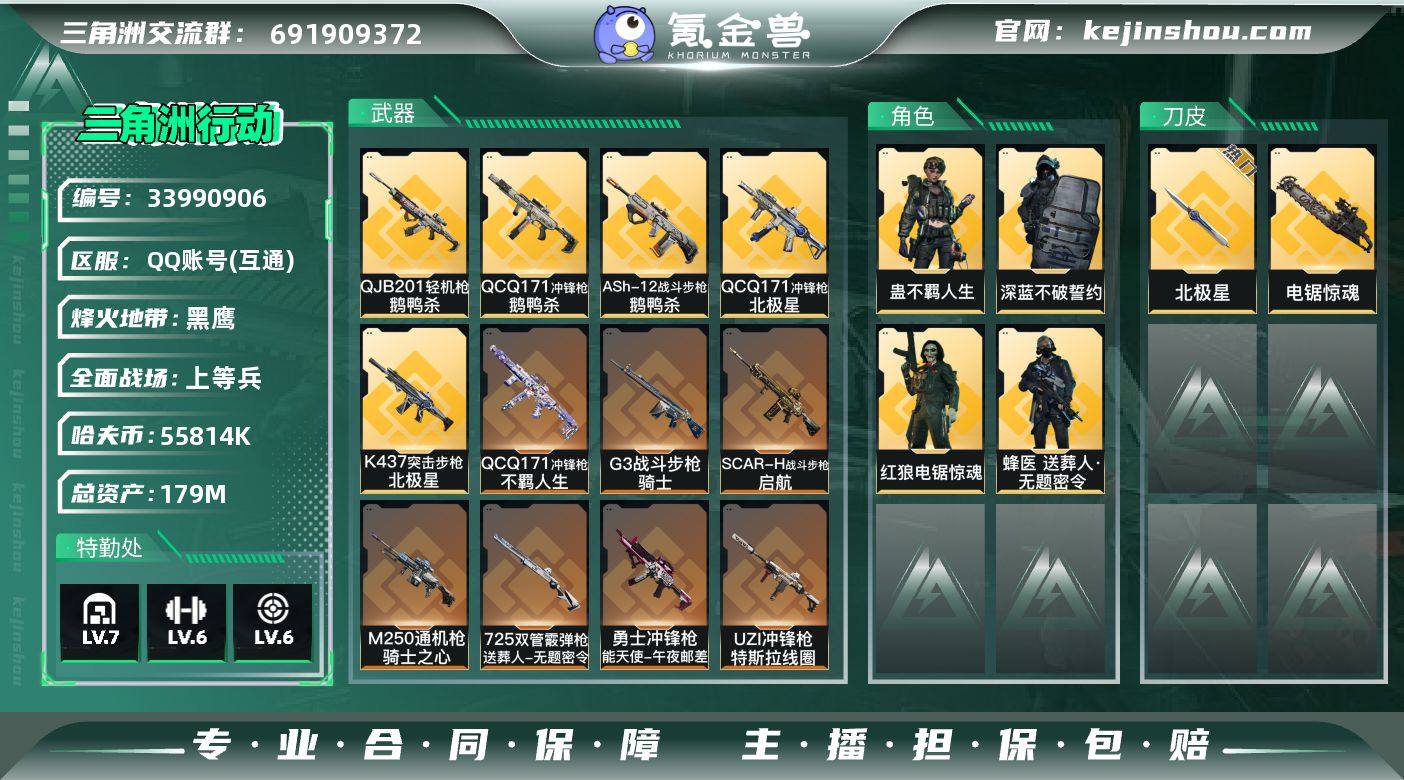【961143】179m总资产-55814k哈夫币-60烽火等级-黑鹰-21战场等级-上等兵 【干员外观】:蜂医-送葬人·无题密令,深蓝-不破誓约,红狼-电锯惊魂,蛊-不羁人生 【近战皮肤】:近战-北极星,近战-电锯惊魂,近战-处刑者3级,近战-黑鹰 【传说外观】:M4A1突击步枪-阿米娅,ASh-12战斗步枪-鹅鸭杀,M16A4突击步枪-狩猎时刻,AK-12突击步枪-特斯拉线圈,SCAR-H战斗步枪-启航,G3战斗步枪-狩猎时刻,G3战斗步枪-骑士,CAR-15突击步枪-阿米娅,K437突击步枪-北极星,Vector冲锋枪-狩猎时刻,UZI冲锋枪-特斯拉线圈,SR-3M紧凑突击步枪-特斯拉线圈,勇士冲锋枪-能天使-午夜邮差,QCQ171冲锋枪-北极星,QCQ171冲锋枪-鹅鸭杀,QCQ171冲锋枪-不羁人生,725双管霰弹枪-送葬人-无题密令,M250通用机枪-骑士之心,QJB201轻机枪-鹅鸭杀 【史诗外观】:AKM突击步枪-林中猎手,ASh-12战斗步枪-无极限,K416突击步枪-阿萨拉特攻,M16A4突击步枪-竞赛选手,AUG突击步枪-蝮蛇,SCAR-H战斗步枪-囚徒,AS Val突击步枪-典狱官,腾龙突击步枪-无垢,腾龙突击步枪-猎鳄行动,K437突击步枪-守护者,MP5冲锋枪-深海恐惧,MP5冲锋枪-战术竞备,MP5冲锋枪-竞技风,P90冲锋枪-紧急戒备,SMG-45冲锋枪-阿萨拉特...