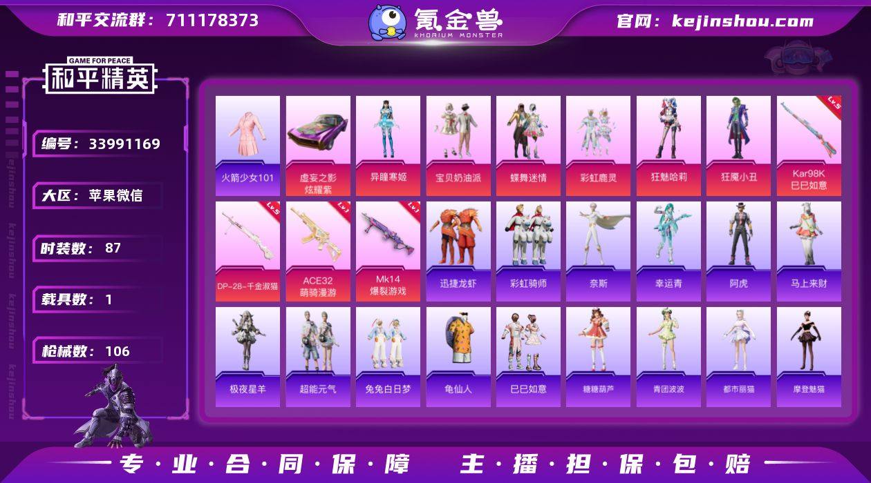 【AZH3891】苹果微信【老101狂魅哈莉狂魇小丑 1载具】6粉装-4特效枪-1载具-3粉色飞行器-32723热力值-4王牌印记-87套装-106枪皮 【热门品类】:套装-火箭少女101,套装-龟仙人 【粉色套装】:粉装-宝贝奶油派,粉装-蝶舞迷情,粉装-彩虹鹿灵,角色-狂魅哈莉,角色-狂魇小丑,角色-异瞳寒姬 【粉色枪皮等级】:ACE32-萌骑漫游(一级),Kar98K-巳巳如意(五级),Mk14-爆裂游戏(一级),DP-28-千金淑猫(五级) 【粉色载具】:虚妄之影(炫耀紫) 【粉色枪皮】:ACE32-萌骑漫游,Kar98K-巳巳如意,Mk14-爆裂游戏,DP-28-千金淑猫 【粉色飞行器】:香车宝马飞行器,萌物绒绒飞行器,双重狂想飞行器 【粉色降落伞】:甜心宝贝降落伞,春暖花开降落伞,雪梅暗香降落伞,圣堂之誓降落伞,金丰海韵降落伞,千金淑猫降落伞,双重狂想降落伞,炫彩糖果降落伞,鸢尾珑雾降落伞 【稀有套装】:套装-龟仙人,套装-巳巳如意,套装-超能元气,套装-彩虹骑师,角色-奈斯,角色-幸运青,角色-阿虎,套装-马上来财,套装-迅捷龙虾,套装-糖糖葫芦,套装-青团波波,角色-都市丽猫,角色-摩登魅猫,套装-雪绒豹,套装-诡诞巡游,套装-混沌火种,角色-极夜星羊 【稀有枪皮】:AKM-春暖花开,AKM-胡桃卫兵...