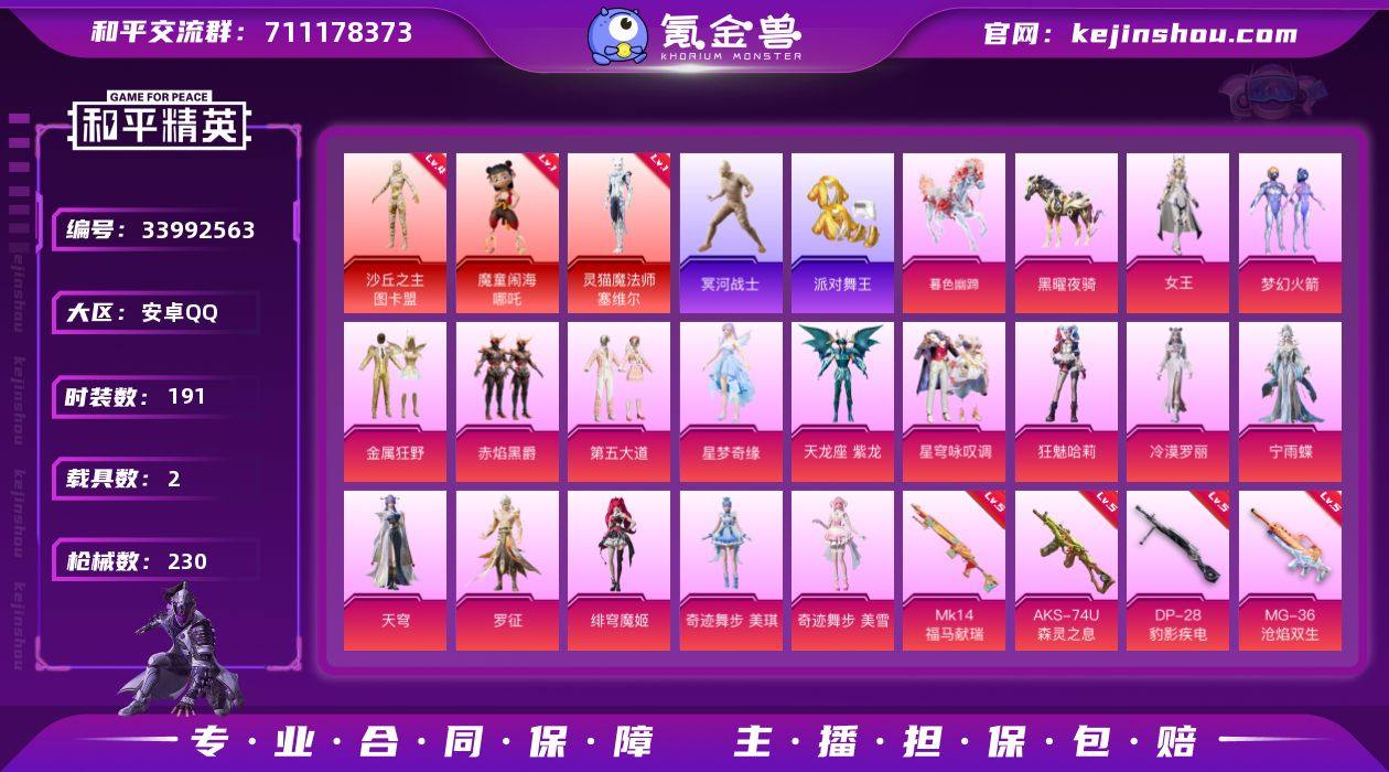【944458】安卓【极品神装号/素材号 魔童闹海-哪吒(一级),灵猫魔法师-塞维尔(一级),沙丘之主-图卡盟(四级),粉装-梦幻火箭,套装-浪漫天命,套装-冥河战士,套装-派对舞王,套装-暗影哥特,角色-8号机,角色-Mark.06,套装-红熊茄茄,AKM-暮色玫影(三级),M416-灵猫魔法师(三级),GROZA-镜光银凌(五级),AUG-星梦奇缘(三级)】 手Q-3神装-17粉装-15特效枪-2载具-9粉色飞行器-84194热力值-5王牌印记-191套装-230枪皮 【红色神装等级】:魔童闹海-哪吒(一级),灵猫魔法师-塞维尔(一级),沙丘之主-图卡盟(四级) 【红色角色神装】:魔童闹海-哪吒,灵猫魔法师-塞维尔,沙丘之主-图卡盟 【热门品类】:粉装-梦幻火箭,套装-浪漫天命,套装-冥河战士,套装-派对舞王,套装-龟仙人,套装-暗影哥特,角色-8号机,角色-Mark.06,套装-红熊茄茄 【粉色套装】:角色-女王,粉装-梦幻火箭,粉装-金属狂野,粉装-赤焰黑爵,粉装-第五大道,角色-星梦奇缘,角色-天龙座 紫龙,粉装-星穹咏叹调,角色-狂魅哈莉,角色-冷漠罗丽,角色-宁雨蝶,角色-天穹,角色-罗征,角色-绯穹魔姬,角色-奇迹舞步 美琪,角色-奇迹舞步 美雪 【粉色枪皮等级】:AKM-暮色玫影(三级),M416-灵猫魔法师(三级),GR...