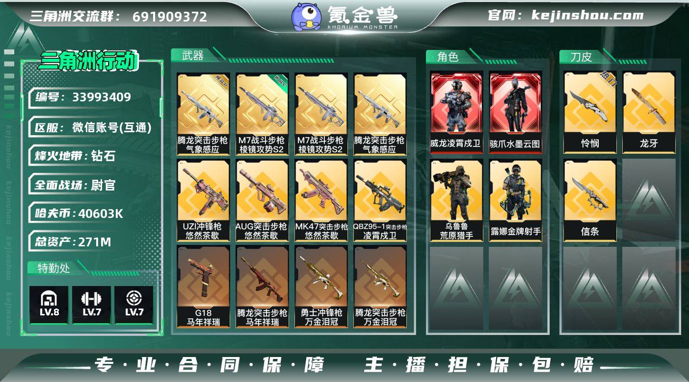 【LXD0127 追封包赔+包人脸】【总资产:271.8m,流动资产:187.6m-2干员红皮:骇爪 水墨云图,威龙 凌霄戍卫-刀皮:信条,怜悯,龙牙】 s8赛季3*3-特勤满体满负-60烽火等级-钻石-42战场等级-尉官 【干员外观】:骇爪-水墨云图,威龙-凌霄戍卫,露娜-金牌射手,乌鲁鲁-荒原猎手 【近战皮肤】:近战-信条,近战-怜悯,近战-龙牙,近战-黑鹰 【典藏外观】:腾龙突击步枪-气象感应,M7战斗步枪-棱镜攻势S2 【典藏外观成色】:腾龙突击步枪-气象感应(极品B),M7战斗步枪-棱镜攻势S2(优品C) 【传说外观】:AKM突击步枪-锦绣,QBZ95-1突击步枪-凌霄戍卫,AUG突击步枪-悠然茶歇,SG552突击步枪-运动员,SCAR-H战斗步枪-水墨云图,腾龙突击步枪-马年祥瑞,腾龙突击步枪-万金泪冠,K437突击步枪-锦绣,MK47突击步枪-悠然茶歇,UZI冲锋枪-悠然茶歇,SMG-45冲锋枪-锦绣,勇士冲锋枪-万金泪冠,M14射手步枪-蛮荒,M14射手步枪-缄花,SR-25射手步枪-缄花,AWM狙击步枪-万金泪冠,.357左轮-缄花,G18-马年祥瑞 【史诗外观】:Ash-12战斗步枪-飓风行动,AK-12突击步枪-原型机,K437突击步枪-私人定制*2,P90冲锋枪-天命*2,SR-25射手步枪-天命*5,ASh-12战斗步枪-碎冰行动,腾龙突击步...