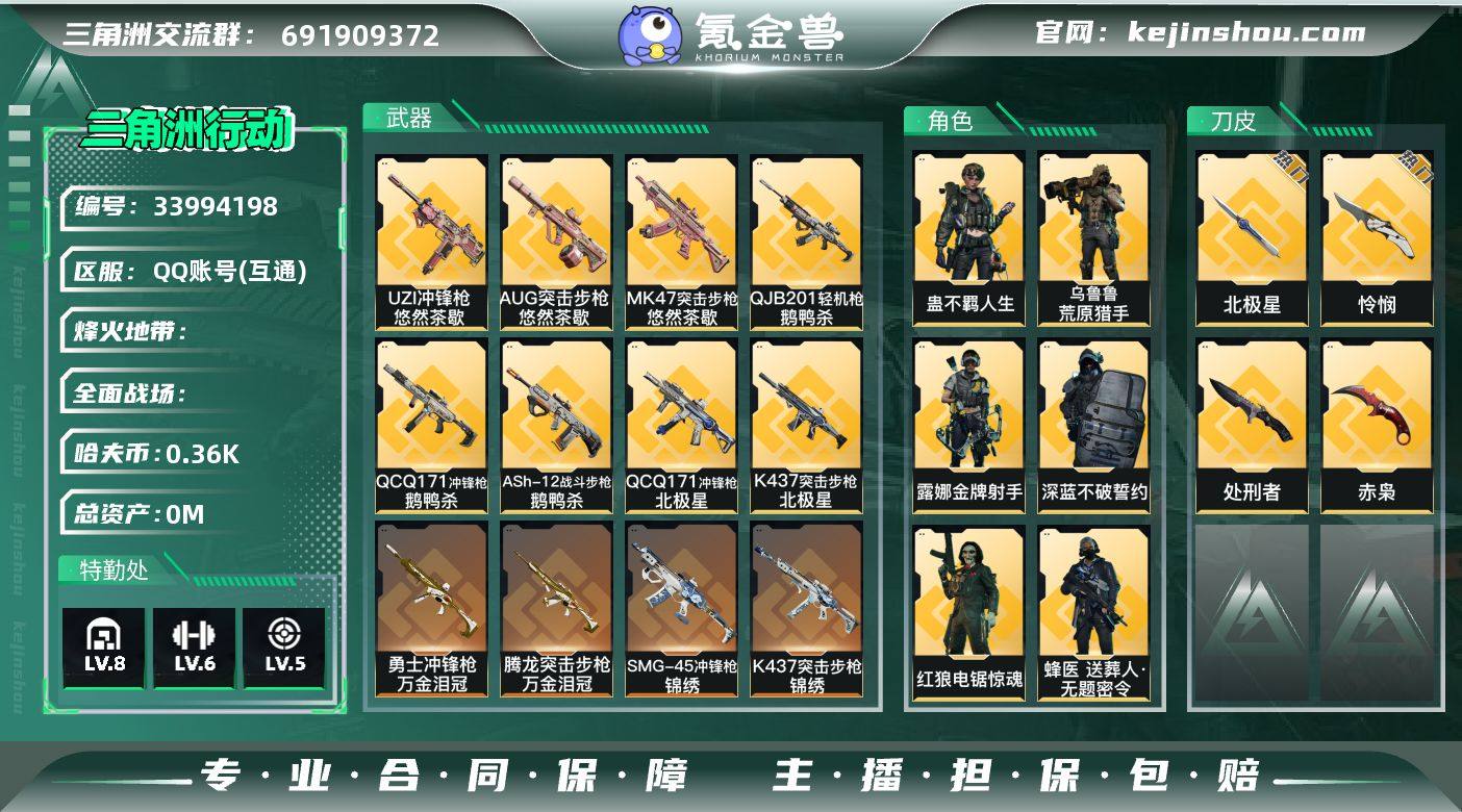43m总资产-365k哈夫币-60烽火等级-钻石-19战场等级-列兵 【干员外观】:蜂医-送葬人·无题密令,深蓝-不破誓约,红狼-电锯惊魂,露娜-金牌射手,乌鲁鲁-荒原猎手,蛊-不羁人生 【近战皮肤】:近战-北极星,近战-怜悯,近战-赤枭,近战-处刑者1级,近战-黑鹰 【传说外观】:M4A1突击步枪-阿米娅,AKM突击步枪-锦绣,ASh-12战斗步枪-鹅鸭杀,AUG突击步枪-悠然茶歇,AUG突击步枪-西装暴徒,SG552突击步枪-运动员,AK-12突击步枪-特斯拉线圈,SCAR-H战斗步枪-启航,CAR-15突击步枪-阿米娅,腾龙突击步枪-捞点薯条,腾龙突击步枪-万金泪冠,K437突击步枪-北极星,K437突击步枪-锦绣,KC17突击步枪-电锯惊魂,MK47突击步枪-悠然茶歇,UZI冲锋枪-特斯拉线圈,UZI冲锋枪-悠然茶歇,SMG-45冲锋枪-锦绣,SR-3M紧凑突击步枪-特斯拉线圈,勇士冲锋枪-能天使-午夜邮差,勇士冲锋枪-万金泪冠,QCQ171冲锋枪-北极星,QCQ171冲锋枪-鹅鸭杀,725双管霰弹枪-送葬人-无题密令,M250通用机枪-骑士之心,QJB201轻机枪-鹅鸭杀,M14射手步枪-蛮荒,AWM狙击步枪-捞点薯条,AWM狙击步枪-万金泪冠,93R-捞点薯条,复合弓-黑·天际线 【史诗外观】:AKM突击步枪-林中猎手,QBZ95-1突击步枪-曙光,ASh-12战斗...