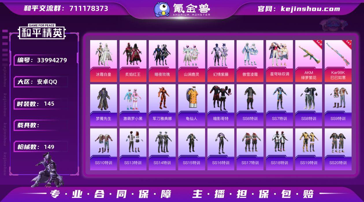 安卓手Q-7粉装-2特效枪-2粉色飞行器-55865热力值-13王牌印记-145套装-149枪皮 【热门品类】:角色-军刀雅典娜,套装-龟仙人,套装-暗影哥特 【粉色套装】:粉装-冰霜白皇,粉装-炙焰红王,粉装-暗夜玫瑰,粉装-山涧鹿灵,粉装-幻情紫藤,粉装-傲雪凌霜,粉装-星穹咏叹调 【粉色枪皮等级】:AKM-绿萝繁花(五级),Kar98K-巳巳如意(一级) 【粉色枪皮】:AKM-绿萝繁花,Kar98K-巳巳如意 【粉色飞行器】:齐天大圣飞行器,星夜魔法师飞行翼 【粉色降落伞】:锦绣火鲤降落伞,夏日绵绵冰降落伞,星之彼岸降落伞,暗夜玫瑰降落伞,恐龙拽拽降落伞,垂柳戏鸭降落伞,天星战神降落伞 【稀有套装】:套装-龟仙人 【稀有枪皮】:AKM-彩虹符号,AKM-灼热熔岩,AKM-破晓战魂,AKM-筑梦精灵,AKM-萌趣颜团子,AKM-龙的传人,M16A4-幻世战舞者,M16A4-甜心亚梦,M16A4-红色方程式,M16A4-蓝色火焰,SCAR-L-暗夜玫瑰,SCAR-L-炫彩节奏,SCAR-L-玉兔迎春,SCAR-L-红色方程式,M416-糯团青竹,M416-红色方程式,M416-蓝色火焰,GROZA-异彩先驱,GROZA-彩虹符号,GROZA-恐龙拽拽,GROZA-治愈之星,GROZA-蓝莓炮弹,AUG-天降萌叽,AUG-耀粉歌者,QBZ-原初圣火,QBZ-彩虹符号,QBZ-赛罗,QBZ-飞驰魅...