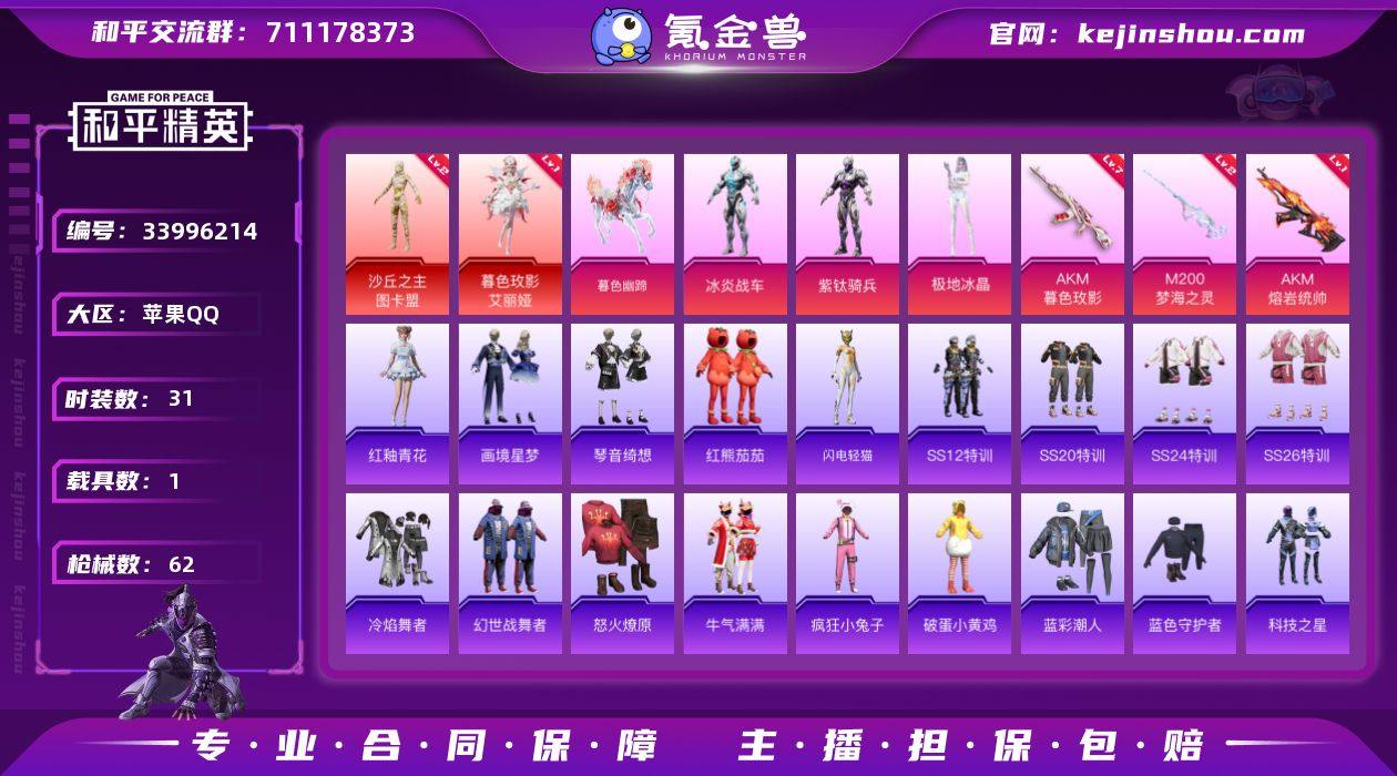 苹果 手Q-2神装-3粉装-3特效枪-1载具-7粉色飞行器-26648热力值-1王牌印记-31套装-62枪皮 【红色神装等级】:暮色玫影-艾丽娅(一级),沙丘之主-图卡盟(二级) 【红色角色神装】:暮色玫影-艾丽娅,沙丘之主-图卡盟 【热门品类】:套装-红熊茄茄 【粉色套装】:角色-冰炎战车,角色-紫钛骑兵,角色-极地冰晶 【粉色枪皮等级】:AKM-熔岩统帅(一级),AKM-暮色玫影(七级),M200-梦海之灵(二级) 【粉色载具】:暮色幽蹄 【粉色枪皮】:AKM-熔岩统帅,AKM-暮色玫影,M200-梦海之灵 【粉色飞行器】:香车宝马飞行器,心之恋语飞行翼,镜光幻境飞行翼,星空武士飞行器,幻海精灵飞行器,圣域金龙飞行器,暮色之舞飞行器 【粉色降落伞】:夏日绵绵冰降落伞,熔岩统帅降落伞,沙丘之主降落伞,精灵梦叶罗丽降落伞,暮色玫影降落伞,鸢尾珑雾降落伞 【稀有套装】:套装-闪电轻猫,套装-画境星梦,套装-琴音绮想,套装-雨过天青,套装-红釉青花 【稀有枪皮】:AKM-四圣焕新,AKM-夜灯,SCAR-L-红色方程式,M416-糯团青竹,M416-红色方程式,GROZA-治愈之星,GROZA-暮色玫影,AUG-耀粉歌者,M762-牛气冲天,Mk47-洛神天依,ACE32-画境星梦,UZI-幻影飞狐,UMP45-怪兽之王,UMP45-生命誓言,V...