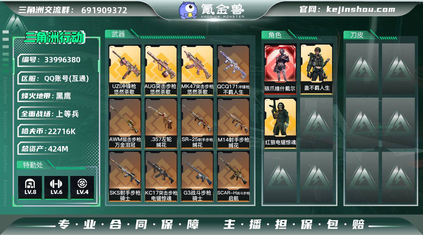 【SJN657】总资产424M/哈夫币2271万/传说近战数1/传说枪皮数15/战场等级23/行动等级60/安全箱等时效性道具以游戏内数据为准,详情请看图/骇爪-维什戴尔/红狼-电锯惊魂/蛊-不羁人生/近战-处刑者4级/近战-黑鹰/M4A1突击步枪-阿米娅/AUG突击步枪-悠然茶歇/SCAR-H战斗步枪-启航/G3战斗步枪-骑士/CAR-15突击步枪-阿米娅/KC17突击步枪-电锯惊魂/MK47突击步枪-悠然茶歇/UZI冲锋枪-悠然茶歇/QCQ171冲锋枪-不羁人生/M14射手步枪-缄花/SKS射手步枪-骑士/SR-25射手步枪-缄花/R93狙击步枪-维什戴尔/AWM狙击步枪-万金泪冠/.357左轮-缄花/QBZ95-1突击步枪-曙光/K416突击步枪-冬日风情/K416突击步枪-阿萨拉特攻/AUG突击步枪-蝮蛇/SG552突击步枪-深海恐惧/SG552突击步枪-哈夫克警备/腾龙突击步枪-猎鳄行动/MP5冲锋枪-深海恐惧/MP5冲锋枪-战术竞备/MP5冲锋枪-竞技风/Vector冲锋枪-猎鳄行动/SMG45冲锋枪-阿萨拉特攻/勇士冲锋枪-深海恐惧/勇士冲锋枪-工业狂潮/MP7冲锋枪-六套之力/S12K霰弹枪-曙光/M250通用机枪-囚徒/QJB201轻机枪-炽焰/M14射手步枪-工业狂潮/SV-98狙击步枪-囚徒/SV98狙击步枪-猎鳄行动/AKM突击步枪-肃杀/QBZ95-1突击步枪-公平竞技/K416突击步枪-一帆风顺/M7战斗步枪-捣蛋鬼/SG552...