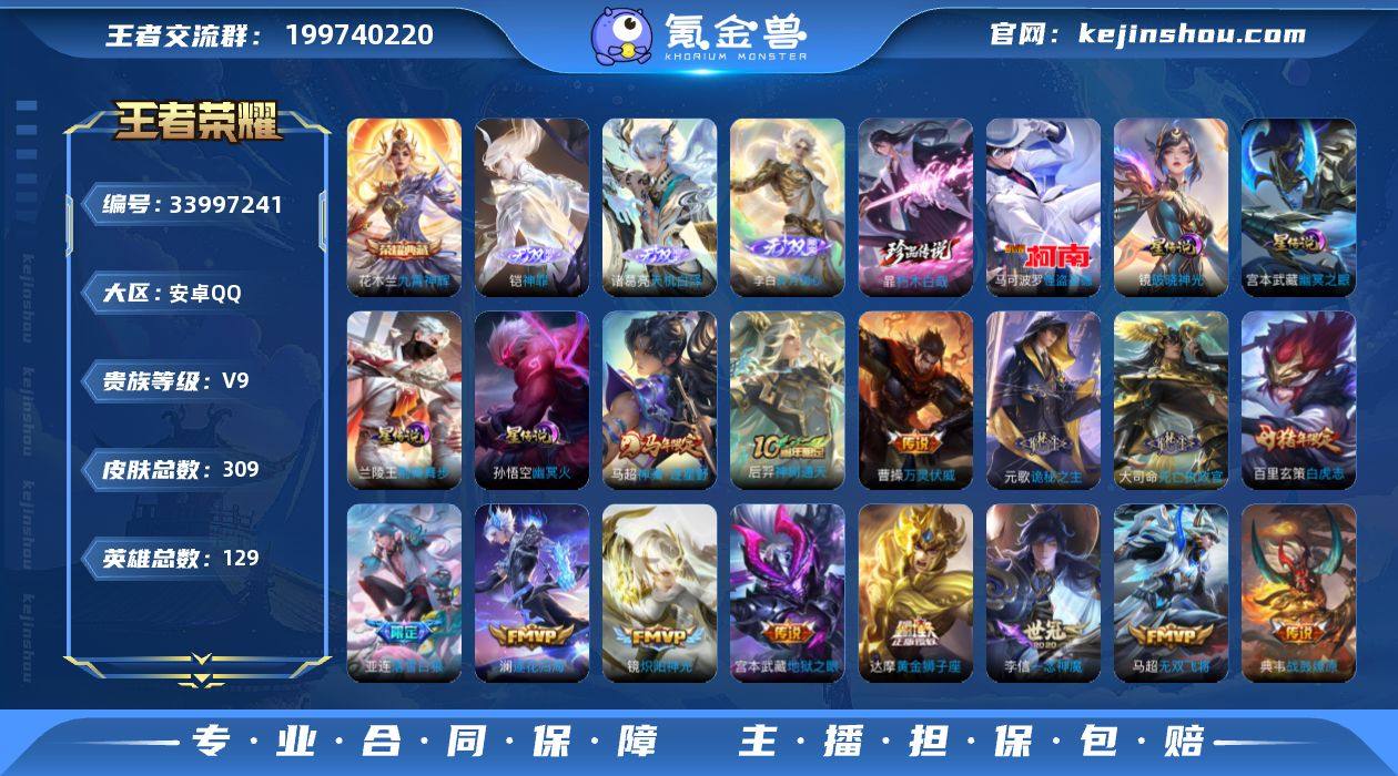 【高性价比·九霄神辉·神罪·天机白泽·碎月剑心·朽木白哉·怪盗基德·荆棘舞步·破晓神光·神骥逐星野·诡秘之主·落雪白狼·逐花归海·兰陵王默契交锋·白虎志·无二次包过】YXw25029-安卓Q-129英雄-309皮肤-12王者印记-110铭文-贵族积分10w【贵族9】【1典藏·3无双·2珍品·4星传说·25传说·22按键·294幸运值】【因赛季更新游戏段付以上号为准!】 【英雄全皮】:孙权全皮,大司命全皮,敖隐全皮,金蝉全皮,影全皮 【荣耀典藏】:花木兰九霄神辉 【无双皮肤】:铠神罪,诸葛亮天机白泽,李白碎月剑心 【珍品传说】:暃朽木白哉,马可波罗怪盗基德 【星元皮肤】:宫本武藏幽冥之眼,孙悟空幽冥火,兰陵王荆棘舞步,镜破晓神光 【传说皮肤】:马超神骥逐星野,后羿神树通天,曹操万灵伏威,元歌诡秘之主,大司命死亡执政官,桑启鸣野蒿,亚连落雪白狼,典韦战鼓燎原,澜逐花归海,吕布怒海麟威,百里守约碎云,马超无双飞将,孙策末日机甲,李元芳飞鸢探春,兰陵王默契交锋,铠绛天战甲,镜炽阳神光,虞姬启明星使,曜云鹰飞将,李信一念神魔,达摩黄金狮子座,百里玄策白虎志,貂蝉仲夏夜之梦,宫本武藏地狱之眼,孙悟空地狱火 【限定皮肤】:蔡文姬夏日便利店,虞姬夏日便利店,姜子牙天穹之...