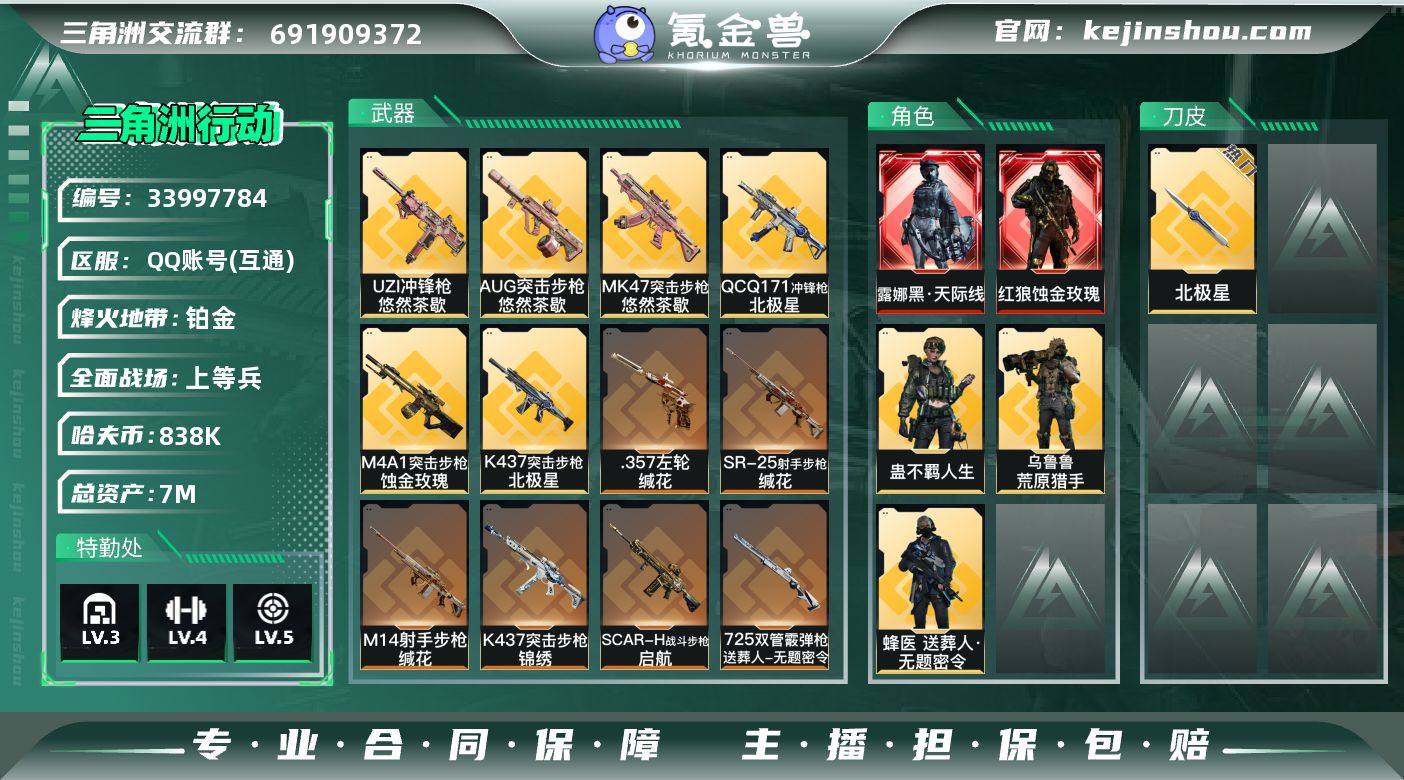 【双红皮北极星·主播同款皮肤号·玫瑰+天际线】 7m总资产-838k哈夫币-60烽火等级-铂金-42战场等级-上等兵 【干员外观】:红狼-蚀金玫瑰,露娜-黑·天际线,蜂医-送葬人·无题密令,乌鲁鲁-荒原猎手,蛊-不羁人生 【近战皮肤】:近战-北极星,近战-黑鹰 【传说外观】:M4A1突击步枪-蚀金玫瑰,M4A1突击步枪-阿米娅,AUG突击步枪-悠然茶歇,AK-12突击步枪-特斯拉线圈,SCAR-H战斗步枪-启航,CAR-15突击步枪-阿米娅,腾龙突击步枪-捞点薯条,K437突击步枪-北极星,K437突击步枪-锦绣,MK47突击步枪-悠然茶歇,UZI冲锋枪-特斯拉线圈,UZI冲锋枪-悠然茶歇,SR-3M紧凑突击步枪-特斯拉线圈,勇士冲锋枪-能天使-午夜邮差,QCQ171冲锋枪-北极星,725双管霰弹枪-送葬人-无题密令,M14射手步枪-蛮荒,M14射手步枪-缄花,SR-25射手步枪-缄花,AWM狙击步枪-捞点薯条,.357左轮-缄花,93R-捞点薯条,复合弓-黑·天际线 【史诗外观】:AKM突击步枪-林中猎手,AKM突击步枪-逆战未来,K416突击步枪-腊梅,M16A4突击步枪-竞赛选手,AUG突击步枪-蝮蛇,SCAR-H战斗步枪-囚徒,AS Val突击步枪-典狱官,腾龙突击步枪-无垢,K437突击步枪-丛影谍踪,SMG-45冲锋枪-阿萨拉特攻,SR-3M紧凑突击步枪-荒野求生...