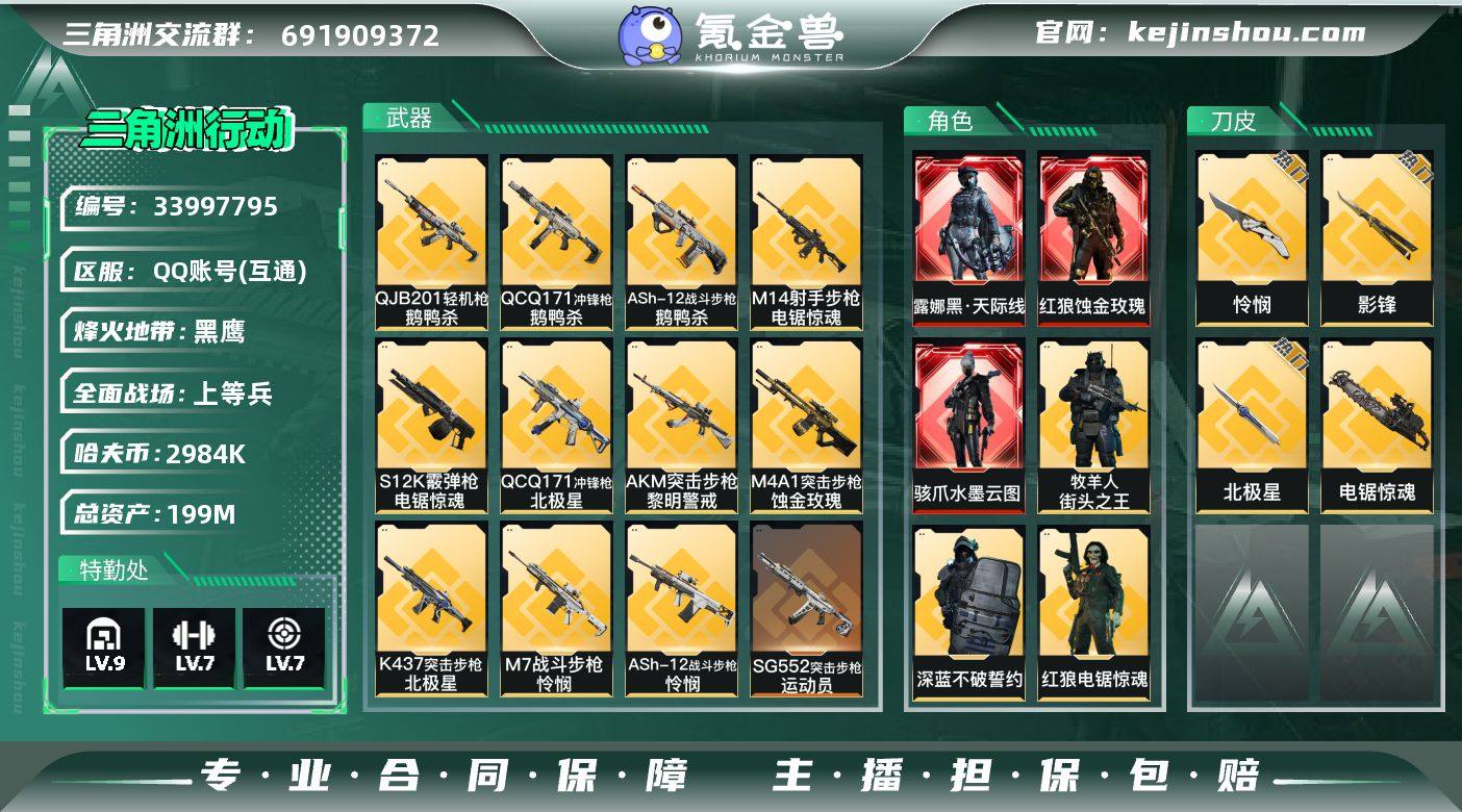 【怜悯北极星影锋刀皮号+多热门红皮号:三红+四刀-铁面判官,蚀金玫瑰+水墨云图+黑天际线+铁面判官】【怜悯+影锋+北极星+电锯惊魂】【Q区三端互通】【无二次】YXz7548-特勤处:仓库9级/靶场7级/训练中心7级-总资产199.8m-哈夫币298w-烽火等级:60级 【干员外观】:红狼-蚀金玫瑰,骇爪-水墨云图,露娜-黑·天际线,威龙-铁面判官,威龙-壮志凌云,蜂医-送葬人·无题密令,牧羊人-街头之王,无名-夜鹰,深蓝-不破誓约,红狼-电锯惊魂 【近战皮肤】:近战-怜悯,近战-影锋,近战-北极星,近战-电锯惊魂,近战-黑鹰 【传说外观】:M4A1突击步枪-蚀金玫瑰,M4A1突击步枪-阿米娅,AKM突击步枪-黎明警戒,QBZ95-1突击步枪-破军,ASh-12战斗步枪-怜悯,ASh-12战斗步枪-鹅鸭杀,M7战斗步枪-神秘艺术,M7战斗步枪-怜悯,M7战斗步枪-维京,SG552突击步枪-运动员,AK-12突击步枪-夜鹰,AK-12突击步枪-特斯拉线圈,SCAR-H战斗步枪-铁艺苍穹,SCAR-H战斗步枪-水墨云图,SCAR-H战斗步枪-启航,G3战斗步枪-骑士,CAR-15突击步枪-黑鹰坠落,CAR-15突击步枪-阿米娅,腾龙突击步枪-捞点薯条,K437突击步枪-北极星,KC17突击步枪-电锯惊魂,P90冲锋枪-神秘艺术,Vector冲锋枪-能天使-午夜邮差,UZI...
