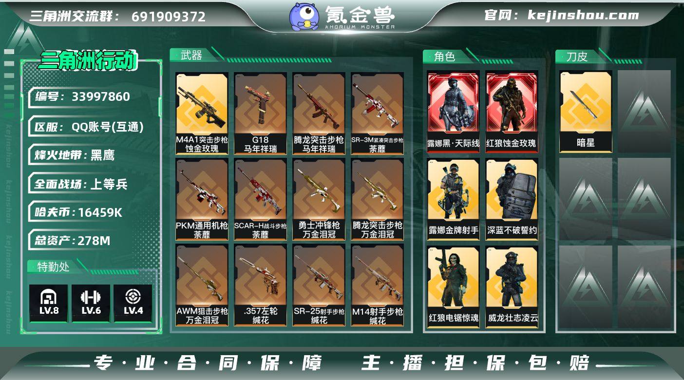 【Q区三端互通】【【无二协助处理】】YXz9311-特勤处:仓库8级/靶场4级/训练中心6级-总资产278m-哈夫币16459w-烽火等级:60级 【干员外观】:红狼-蚀金玫瑰,露娜-黑·天际线,威龙-壮志凌云,蜂医-送葬人·无题密令,无名-夜鹰,深蓝-不破誓约,红狼-电锯惊魂,露娜-金牌射手 【近战皮肤】:近战-暗星,近战-处刑者2级,近战-黑鹰 【传说外观】:M4A1突击步枪-蚀金玫瑰,M4A1突击步枪-阿米娅,K416突击步枪-行动记录,M16A4突击步枪-狩猎时刻,SG552突击步枪-运动员,AK-12突击步枪-夜鹰,SCAR-H战斗步枪-铁艺苍穹,SCAR-H战斗步枪-启航,SCAR-H战斗步枪-荼蘼,G3战斗步枪-狩猎时刻,G3战斗步枪-骑士,CAR-15突击步枪-阿米娅,腾龙突击步枪-捞点薯条,腾龙突击步枪-马年祥瑞,腾龙突击步枪-万金泪冠,KC17突击步枪-电锯惊魂,Vector冲锋枪-狩猎时刻,SMG-45冲锋枪-骑士,SR-3M紧凑突击步枪-荼蘼,勇士冲锋枪-能天使-午夜邮差,勇士冲锋枪-万金泪冠,725双管霰弹枪-送葬人-无题密令,PKM通用机枪-荼蘼,M250通用机枪-骑士之心,M14射手步枪-缄花,SKS射手步枪-骑士,SR-25射手步枪-缄花,AWM狙击步枪-捞点薯条,AWM狙击步枪-万金泪冠,.357左轮-缄花,G18-马年祥瑞,93R-捞点薯...