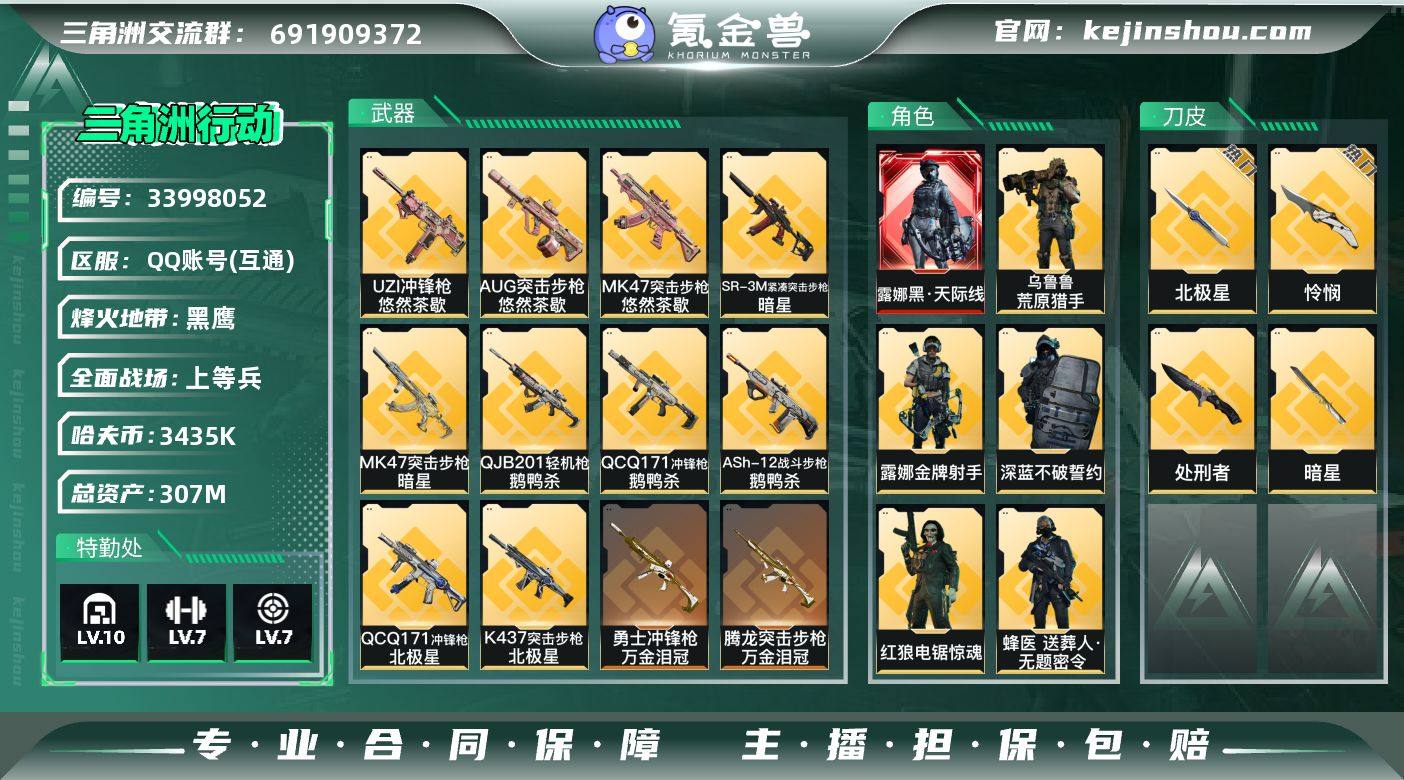 【多热门刀皮号-单联动红皮黑天际线:黑天际线+北极星+暗星+怜悯+处刑者,高额资产307M】【【无二次协助处理】】-特勤处:仓库10级/靶场7级/训练中心7级-总资产307m-343w哈伏币-60烽火等级-黑鹰-33战场等级-上等兵 【干员外观】:露娜-黑·天际线,蜂医-送葬人·无题密令,深蓝-不破誓约,红狼-电锯惊魂,露娜-金牌射手,乌鲁鲁-荒原猎手 【近战皮肤】:近战-暗星,近战-北极星,近战-怜悯,近战-处刑者1级,近战-黑鹰 【传说外观】:M4A1突击步枪-阿米娅,ASh-12战斗步枪-鹅鸭杀,K416突击步枪-行动记录,AUG突击步枪-悠然茶歇,SG552突击步枪-运动员,AK-12突击步枪-特斯拉线圈,SCAR-H战斗步枪-水墨云图,SCAR-H战斗步枪-启航,G3战斗步枪-骑士,CAR-15突击步枪-阿米娅,AS Val突击步枪-蛇年祥瑞,腾龙突击步枪-捞点薯条,腾龙突击步枪-万金泪冠,K437突击步枪-北极星,KC17突击步枪-电锯惊魂,MK47突击步枪-悠然茶歇,MK47突击步枪-暗星,UZI冲锋枪-特斯拉线圈,UZI冲锋枪-悠然茶歇,SR-3M紧凑突击步枪-特斯拉线圈,SR-3M紧凑突击步枪-暗星,勇士冲锋枪-能天使-午夜邮差,勇士冲锋枪-万金泪冠,QCQ171冲锋枪-北极星,QCQ171冲锋枪-鹅鸭杀,725双管霰弹枪-送葬人-无题密令,M...
