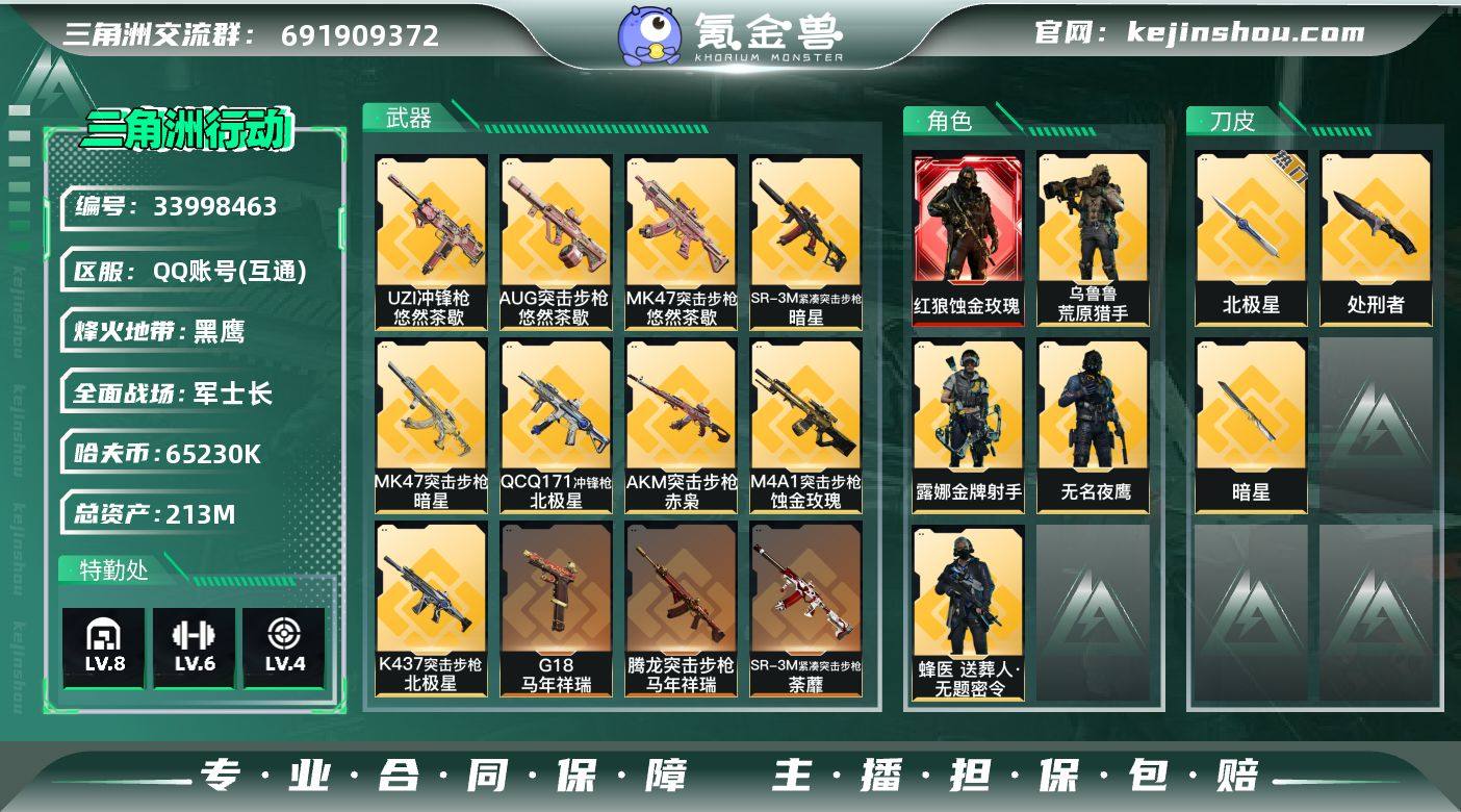 【Q区三端互通】【无二次】YXz9501-特勤处:仓库8级/靶场4级/训练中心6级-总资产213m-哈夫币6523w-烽火等级:60级 【干员外观】:红狼-蚀金玫瑰,蜂医-送葬人·无题密令,无名-夜鹰,露娜-金牌射手,乌鲁鲁-荒原猎手 【近战皮肤】:近战-暗星,近战-北极星,近战-处刑者1级,近战-黑鹰 【传说外观】:M4A1突击步枪-蚀金玫瑰,M4A1突击步枪-阿米娅,AKM突击步枪-赤枭,AKM突击步枪-锦绣,K416突击步枪-行动记录,M16A4突击步枪-狩猎时刻,AUG突击步枪-悠然茶歇,SG552突击步枪-运动员,AK-12突击步枪-夜鹰,AK-12突击步枪-特斯拉线圈,SCAR-H战斗步枪-启航,SCAR-H战斗步枪-荼蘼,G3战斗步枪-狩猎时刻,CAR-15突击步枪-阿米娅,腾龙突击步枪-马年祥瑞,K437突击步枪-北极星,K437突击步枪-锦绣,MK47突击步枪-悠然茶歇,MK47突击步枪-暗星,Vector冲锋枪-狩猎时刻,UZI冲锋枪-特斯拉线圈,UZI冲锋枪-悠然茶歇,SMG-45冲锋枪-骑士,SMG-45冲锋枪-锦绣,SR-3M紧凑突击步枪-特斯拉线圈,SR-3M紧凑突击步枪-暗星,SR-3M紧凑突击步枪-荼蘼,勇士冲锋枪-能天使-午夜邮差,QCQ171冲锋枪-北极星,725双管霰弹枪-送葬人-无题密令,PKM通用机枪-荼蘼,M250通用机枪-骑士之心,M14射手步枪-...
