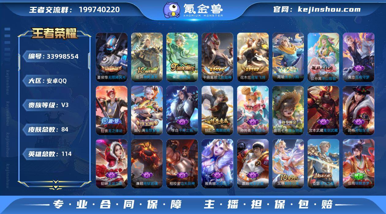 安卓Q-V3-永恒钻石III段位-114英雄-84皮肤-1典藏皮肤-4传说-15史诗 【荣耀典藏】:夏侯惇无限飓风号 【传说皮肤】:后羿神树通天,桑启鸣野蒿,干将莫邪久胜战神,花木兰冠军飞将 【限定皮肤】:姜子牙天穹之誓,狄仁杰阴阳师,达摩沙漠行僧,沈梦溪大漠名商,鲁班大师探海日志,桑启海盐诗旅,张良古海寻踪,鬼谷子天穹祈灯,姬小满妄想食味,鲁班七号蔬乡物语,李元芳蔬乡物语,刘邦剑破天穹,程咬金群星魔术团,周瑜熔金海岸 【赛季限定】:达摩沙漠行僧,沈梦溪大漠名商,桑启海盐诗旅,鲁班大师探海日志,张良古海寻踪,鬼谷子天穹祈灯,刘邦剑破天穹,姜子牙天穹之誓,东皇太一噬灭天穹,太乙真人谧流熔炉,钟馗虚灵犬护,甄姬逆浪荇歌,亚瑟荣光之誓 【战令限定】:鲁班七号蔬乡物语,李元芳蔬乡物语,周瑜线条小狗 【史诗皮肤】:周瑜线条小狗,公孙离涂山容容,黄忠百相守梦,狂铁龙之律动,鲁班七号蔬乡物语,姬小满妄想食味,狄仁杰鹰眼统帅,程咬金功夫厨神,雅典娜冰冠公主,李白千年之狐,吕布圣诞狂欢,嬴政摇滚巨星,孙尚香水果甜心,宫本武藏鬼剑武藏,廉颇地狱岩魂,貂蝉圣诞恋歌 【其他皮肤】:艾琳鹤鸣心笺,亚瑟荣光之誓,莱西奥踏浪烽翎,庄周锦麟游梦...