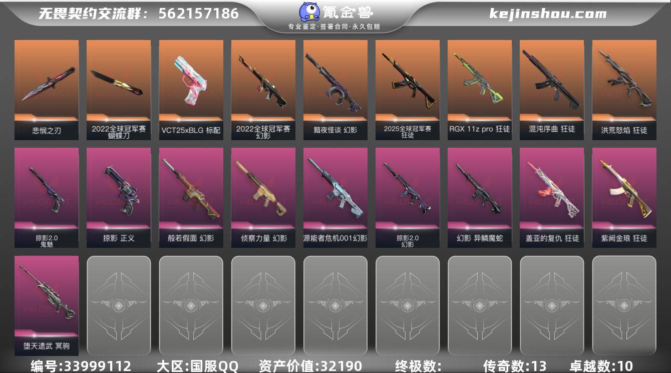 段位: 钻石 亮点皮肤: 幻影-2022全球冠军赛,蝴蝶刀-2022全球冠军赛 近战武器皮肤: 无畏契约季前邀请赛 悲悯之刃 步枪皮肤: 狂徒-紫阙金琅,狂徒-盖亚的复仇,幻影-侦察力量,幻影-源能者危机001,狂徒-洪荒怒焰,幻影-般若假面,狂徒-混沌序曲,幻影-黯夜怪谈,幻影-异鳞魔蛇,狂徒-RGX 11z pro,幻影-掠影2.0,2025全球冠军赛 狂徒 佩枪皮肤: 正义-掠影,标配-VCT25xBLG,鬼魅-掠影2.0 狙击枪皮肤: 冥驹-堕天遗武 亮点: 【充值总皮肤】: RGX 11z Pro 狂徒, 无畏契约季前邀请赛 悲悯之刃, 异鳞魔蛇 幻影, 混沌序曲 狂徒, 2025全球冠军赛 狂徒, VCT25 x BLG 标配, 堕天遗武 冥驹, 黯夜怪谈 幻影, 侦察力量 幻影, 般若假面 幻影, 掠影//2.0 鬼魅, 掠影//2.0 幻影, 紫阙金琅 狂徒, 2022全球冠军赛 幻影, 2022全球冠军赛 蝴蝶刀, 洪荒怒焰 狂徒, 掠影 正义, 源能者危机001 幻影, 盖亚的复仇 狂徒