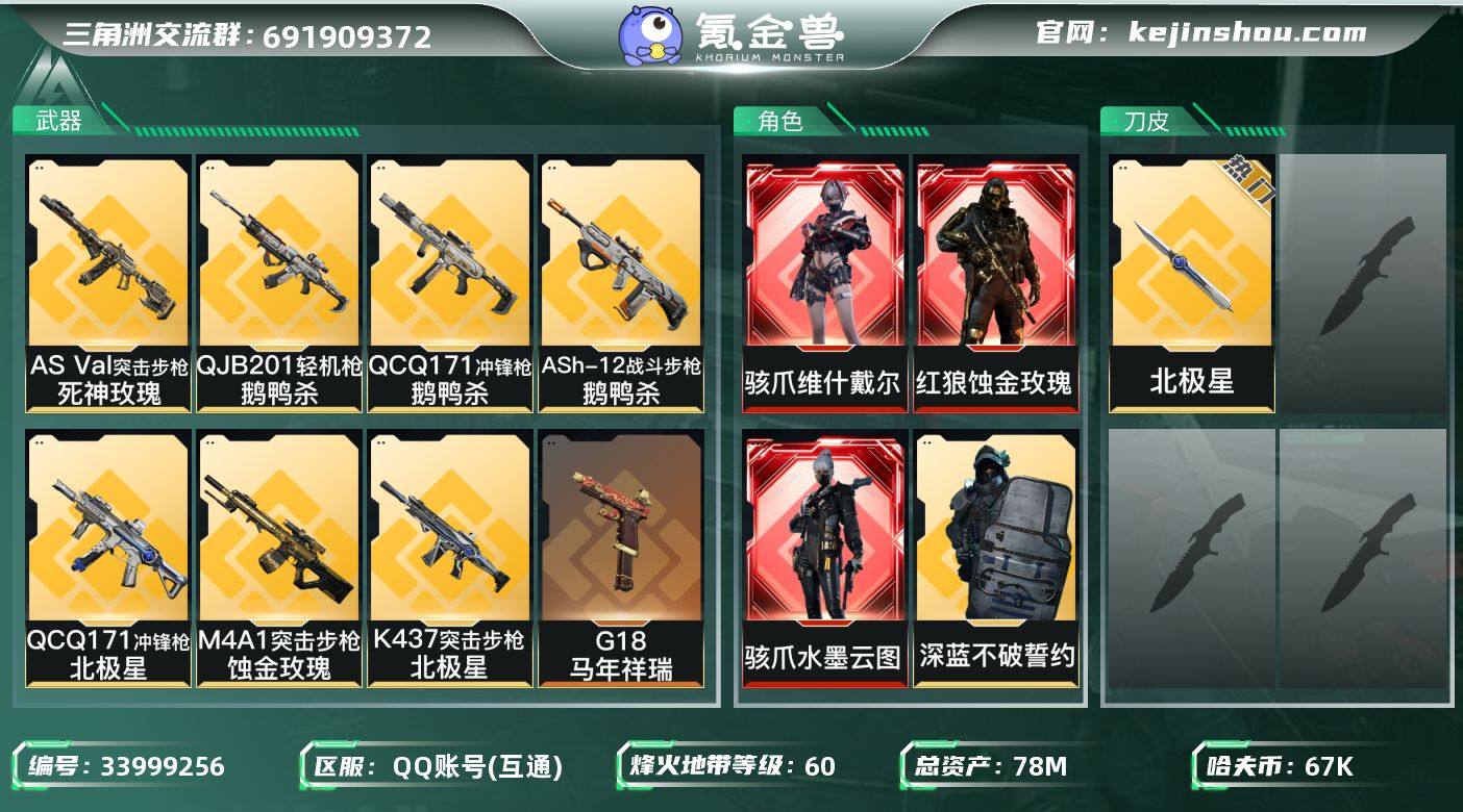 【SJ8011】总资产78M/哈夫币6万/传说近战数1/传说枪皮数31/战场等级31/行动等级60/安全箱等时效性道具以游戏内数据为准,详情请看图/红狼-蚀金玫瑰/骇爪-水墨云图/骇爪-维什戴尔/蜂医-送葬人·无题密令(S5)/深蓝-不破誓约(S6)/红狼-电锯惊魂/近战-北极星/近战-黑鹰/M4A1突击步枪-蚀金玫瑰/M4A1突击步枪-阿米娅/ASh-12战斗步枪-鹅鸭杀/M16A4突击步枪-狩猎时刻/AK-12突击步枪-特斯拉线圈/SCAR-H战斗步枪-水墨云图/SCAR-H战斗步枪-启航/G3战斗步枪-狩猎时刻/G3战斗步枪-骑士/CAR-15突击步枪-阿米娅/AS Val突击步枪-死神玫瑰/腾龙突击步枪-马年祥瑞/K437突击步枪-北极星/KC17突击步枪-电锯惊魂/Vector冲锋枪-狩猎时刻/UZI冲锋枪-特斯拉线圈/SMG45冲锋枪-骑士/SR-3M紧凑突击步枪-特斯拉线圈/勇士冲锋枪-能天使-午夜邮差/QCQ171冲锋枪-北极星/QCQ171冲锋枪-鹅鸭杀/725双管霰弹枪-送葬人-无题密令/M250通用机枪-骑士之心/QJB201轻机枪-鹅鸭杀/M14射手步枪-缄花/SR-25射手步枪-水墨云图/SR-25射手步枪-缄花/R93狙击步枪-维什戴尔/.357左轮-缄花/G18-马年祥瑞/复合弓-黑-天际线/AKM突击步枪-林中猎手/QBZ95-1突击步枪-曙光/ASh-12战斗步枪-无极限/K416突击步枪-阿萨拉特攻/M16A4突击步枪...