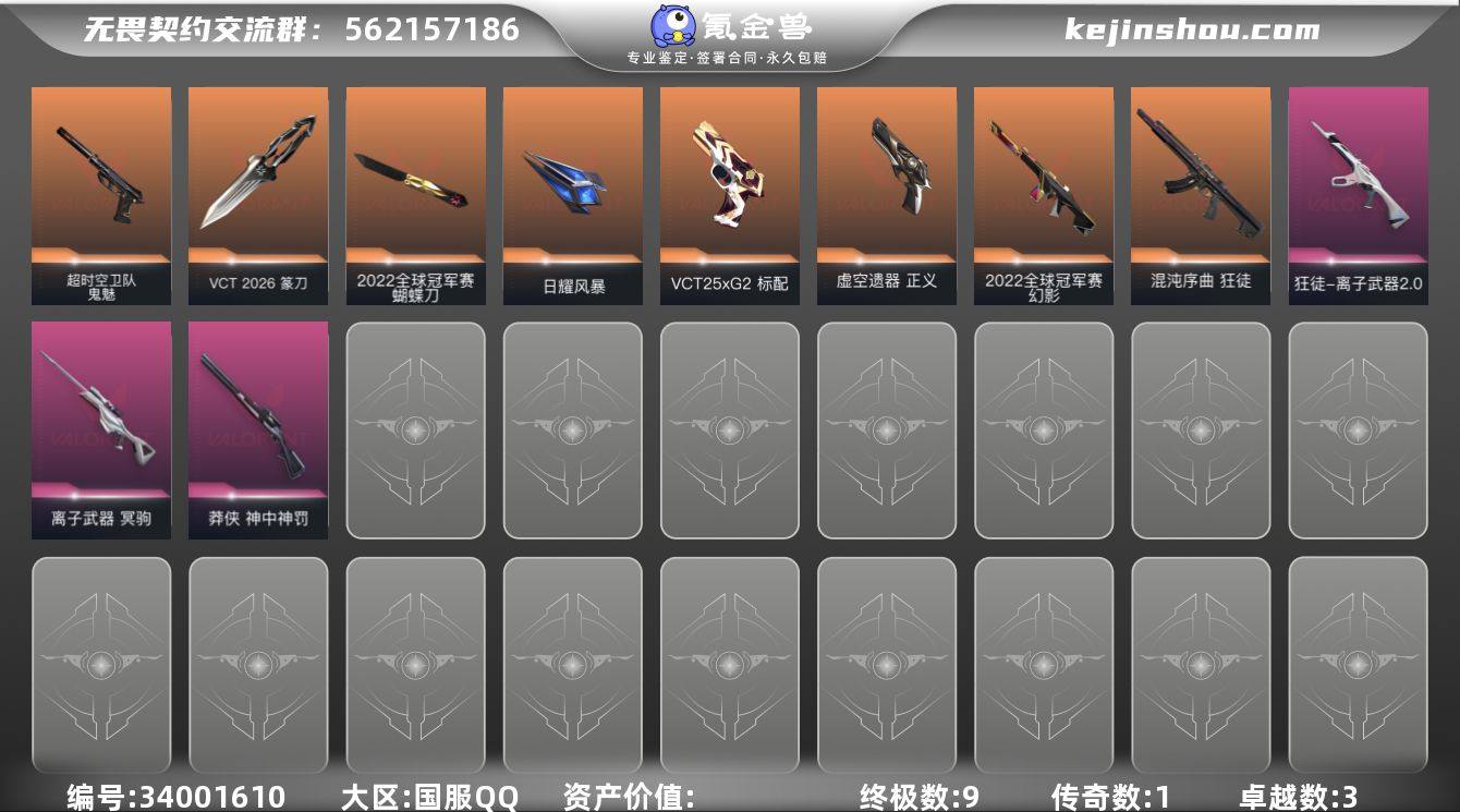 【套装】:2022全球冠军赛套装,VCT 2026 赛季套装 【英雄】:炼狱,维斯,暮蝶,壹决,铁臂,捷风,不死鸟,贤者,猎枭,芮娜,尚勃勒,霓虹,斯凯,夜露,K/O,盖可,黑梦 【近战武器】:近战武器-2022全球冠军赛 蝴蝶刀,近战武器-VCT 2026 篆刀,近战武器-紫金爪刀,近战武器-日耀风暴 遗器 【狂徒】:狂徒-混沌序曲,狂徒-离子武器//2.0 【幻影】:幻影-2022全球冠军赛 【冥驹】:冥驹-离子武器 【莽侠】:莽侠-神中神罚 【VCT手枪】:标配-VCT25 x G2 【正义】:正义-虚空遗器 【鬼魅】:鬼魅-超时空卫队 【狂怒】:狂怒-蒙太奇 【卡面】:无畏契约:暮蝶 卡面,热舞环节 卡面,树懒大作战 卡面,Clutch 卡面,无畏契约GO!第一卷:芮娜 卡面,无畏契约GO!第一卷:零 卡面,无垠星环 卡面,《双城之战》金克丝 卡面,代号红色 卡面,新兵报到 卡面,V契约 卡面,无畏契约 卡面 【喷漆】:伤心心 喷漆,喜欢哪种毒? 喷漆,VCT x G2 喷漆,买装还是存钱 喷漆,无畏契约GO!第一卷:零 喷漆,暴走萝莉 喷漆,放下武器 喷漆,胜利属于无畏契约 喷漆,GLHF 喷漆,无畏契约 喷漆 【挂饰】:V25第三幕:超凡 挂饰,瞬云履 挂饰,薰衣草之心 挂饰,动力机箱 挂饰,VCT x G2 挂...