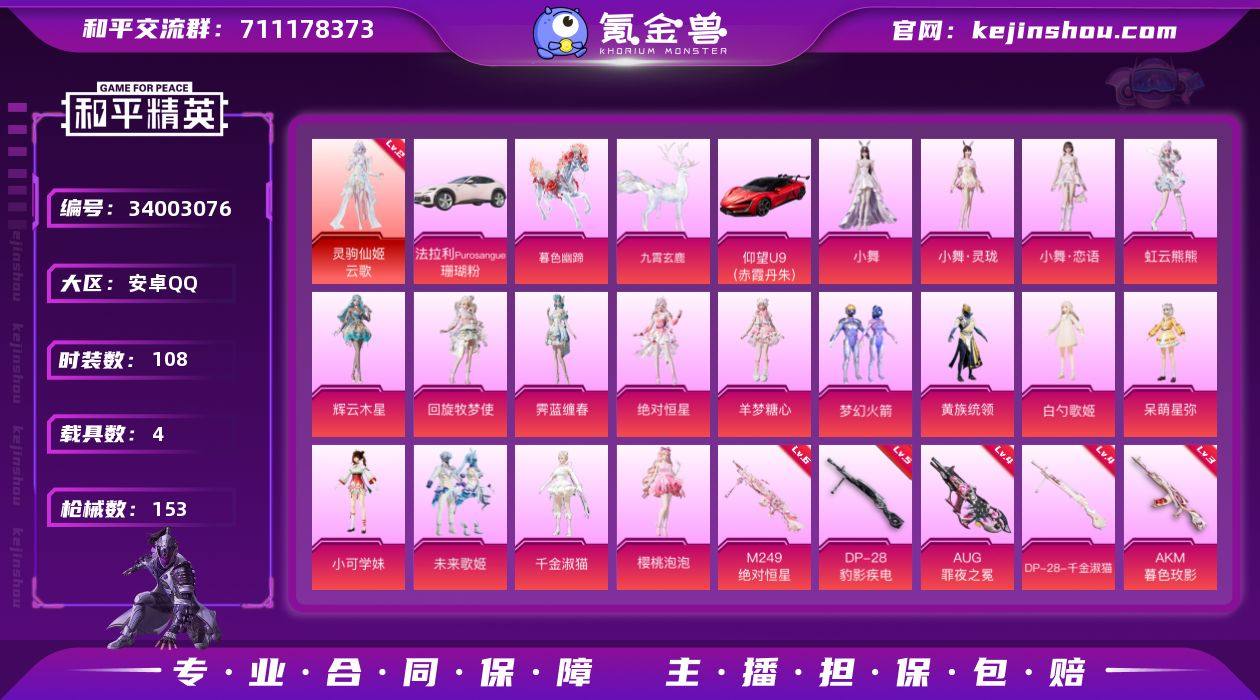 无二次-安卓手Q精品女神小裙子号-1神装-17粉装-12特效枪-4载具-14粉色飞行器-59864热力值-4王牌印记-108套装-153枪皮 【红色神装等级】:灵驹仙姬-云歌(二级) 【红色角色神装】:灵驹仙姬-云歌 【热门品类】:粉装-梦幻火箭,套装-小丑鱼 【粉色套装】:角色-绝对恒星,粉装-梦幻火箭,粉装-黄族统领,角色-白勺歌姬,角色-呆萌星弥,角色-小可学妹,粉装-未来歌姬,角色-千金淑猫,角色-樱桃泡泡,角色-羊梦糖心,角色-霁蓝缠春,角色-回旋牧梦使,角色-辉云木星,角色-虹云熊熊,人物-小舞,人物-小舞·灵珑,人物-小舞·恋语 【粉色枪皮等级】:AKM-暮色玫影(三级),SCAR-L-灵驹仙姬(一级),GROZA-精灵之光(三级),AUG-罪夜之冕(四级),ACE32-萌骑漫游(二级),AKS-74U-森灵之息(一级),Mk14-樱桃泡泡(一级),Mk14-福马献瑞(一级),M200-梦海之灵(三级),M249-绝对恒星(六级),DP-28-千金淑猫(四级),DP-28-豹影疾电(五级) 【粉色载具】:法拉利Purosangue(珊瑚粉),仰望U9(赤霞丹朱),暮色幽蹄,九霄玄鹿 【粉色枪皮】:AKM-暮色玫影,SCAR-L-灵驹仙姬,GROZA-精灵之光,AUG-罪夜之冕,ACE32-萌骑漫游,AKS-74U-森灵之息,Mk14-樱桃泡泡,Mk14-福马献瑞,M200-梦海之灵,...