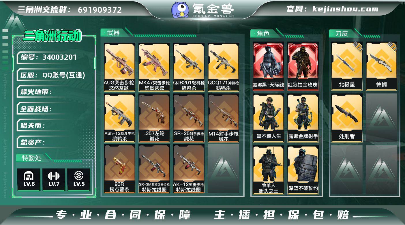 实名: 可修改 干员外观: 威龙-铁面判官(S1),红狼-蚀金玫瑰,牧羊人-街头之王(S2),威龙-壮志凌云(S3),无名-夜鹰(S4),蜂医-送葬人·无题密令(S5),露娜-黑·天际线,深蓝-不破誓约(S6),红狼-电锯惊魂,露娜-金牌射手(S7),蛊-不羁人生 传说武器皮肤: 近战-怜悯,近战-北极星,93R-捞点薯条,AK-12突击步枪-特斯拉线圈,SR-3M紧凑突击步枪-特斯拉线圈,ASh-12战斗步枪-鹅鸭杀,QCQ171冲锋枪-鹅鸭杀,QJB201轻机枪-鹅鸭杀,近战-处刑者,.357左轮-缄花,SR-25射手步枪-缄花,M14射手步枪-缄花,MK47突击步枪-悠然茶歇,AUG突击步枪-悠然茶歇 亮点: hf16854总资产58m+黑天际线全套+不羁人生全套+蚀金玫瑰全套+电锯惊魂红狼+北极星全套+怜悯刀+处刑者刀+鹅鸭杀全套+捞点薯条全套+特斯拉线圈全套+缄花全套+悠然茶歇全套+s1s2s3s4s5s6s7赛季通行证+烽火等级60+特勤部门等级可以+s1s2s3s4s5s6s8+永久包赔